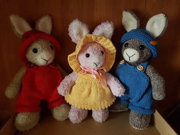 Заяц в красном комбезе связан из ADELIA, в желтом сарафанчике - из детской Baby Smiles