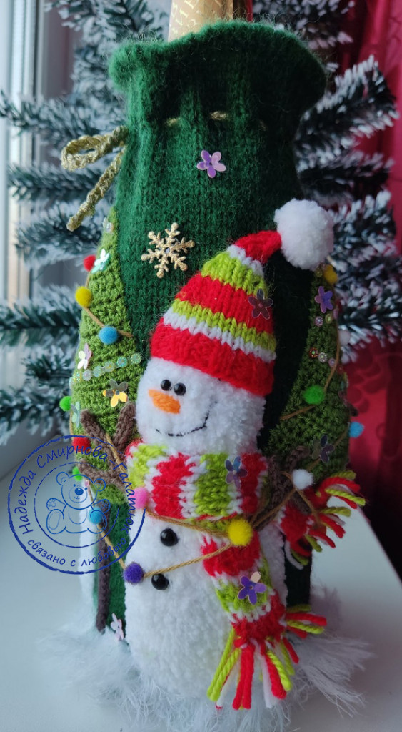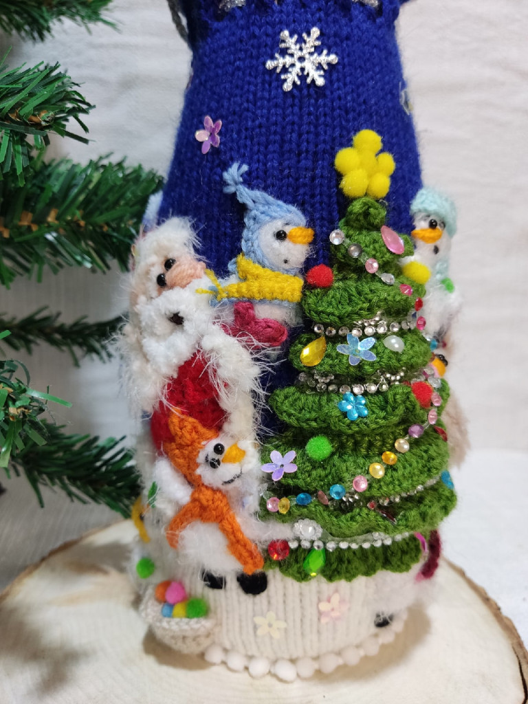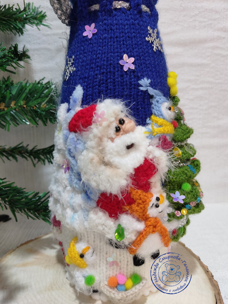 Вот такая ёлка вышла к новому году. вязаный чехол из пушистых ниток одет на пенопластовый конус, украсила игрушками и стилизованная красавица готова.
