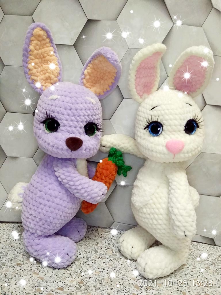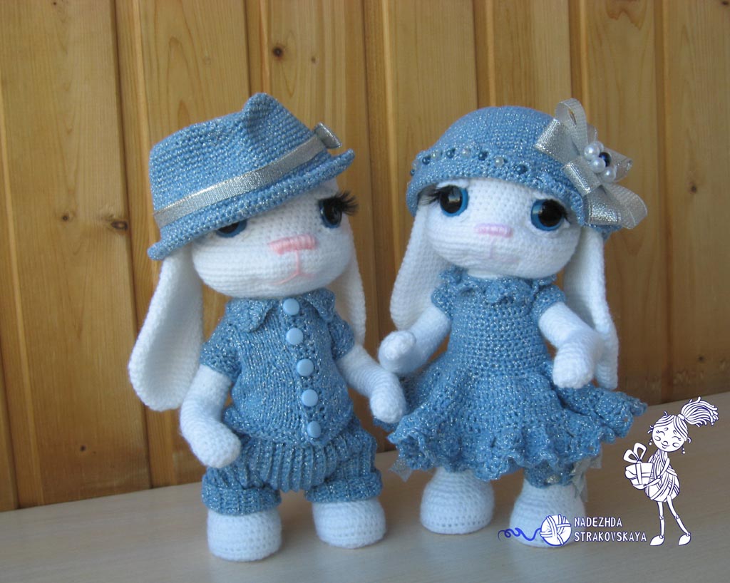 Парочка зайчиков. Связаны на основе авторского МК. Крючок 1,5. Пряжа Детская новинка, и какой-то неопознанный акрил с люрексом.