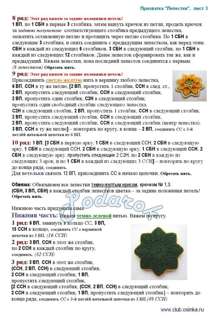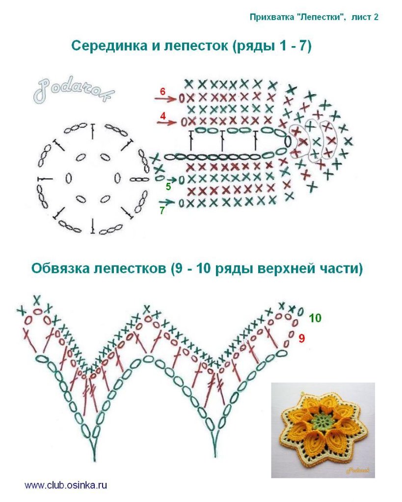 Прихватка крючком "Лепестки". Идея этой прихватки была позаимствована на сайте Pink Rose Crochet, перевела, доработала и оформила в красивый и удобный вид Наталья Руденко.