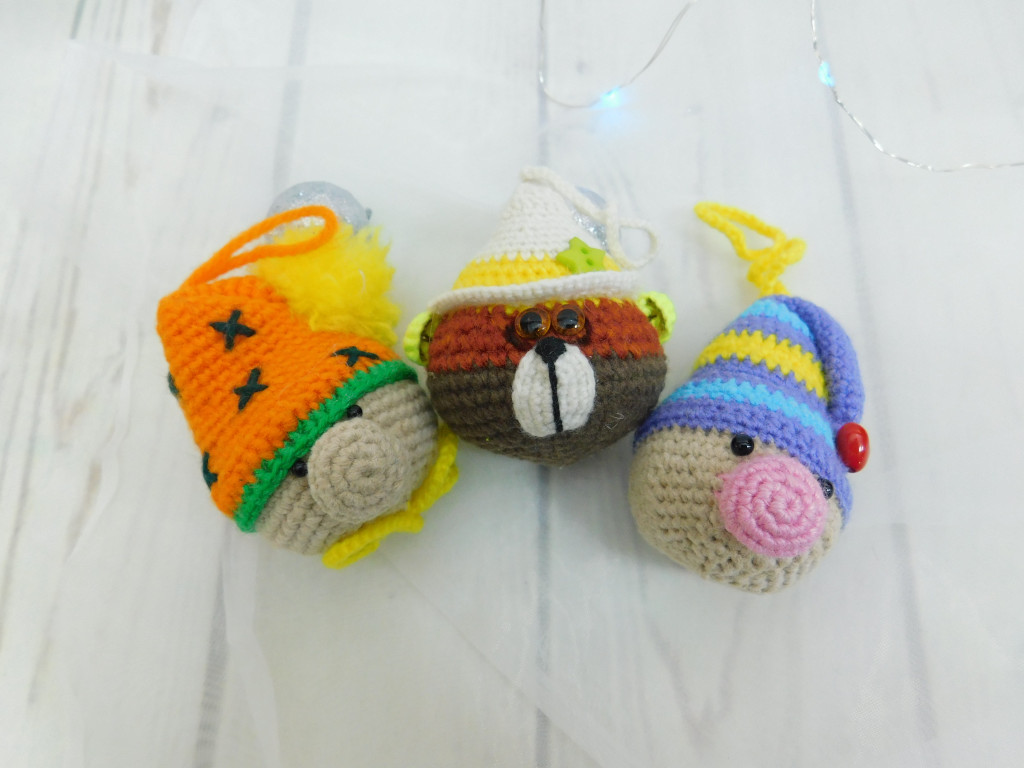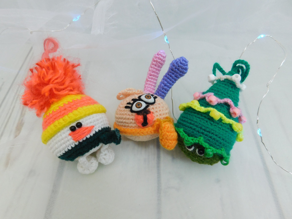 Хочу подарить вязаные ёлочные игрушки, вязала их для ярко-ниточного конкурса и они отважно там поучаствовали.
