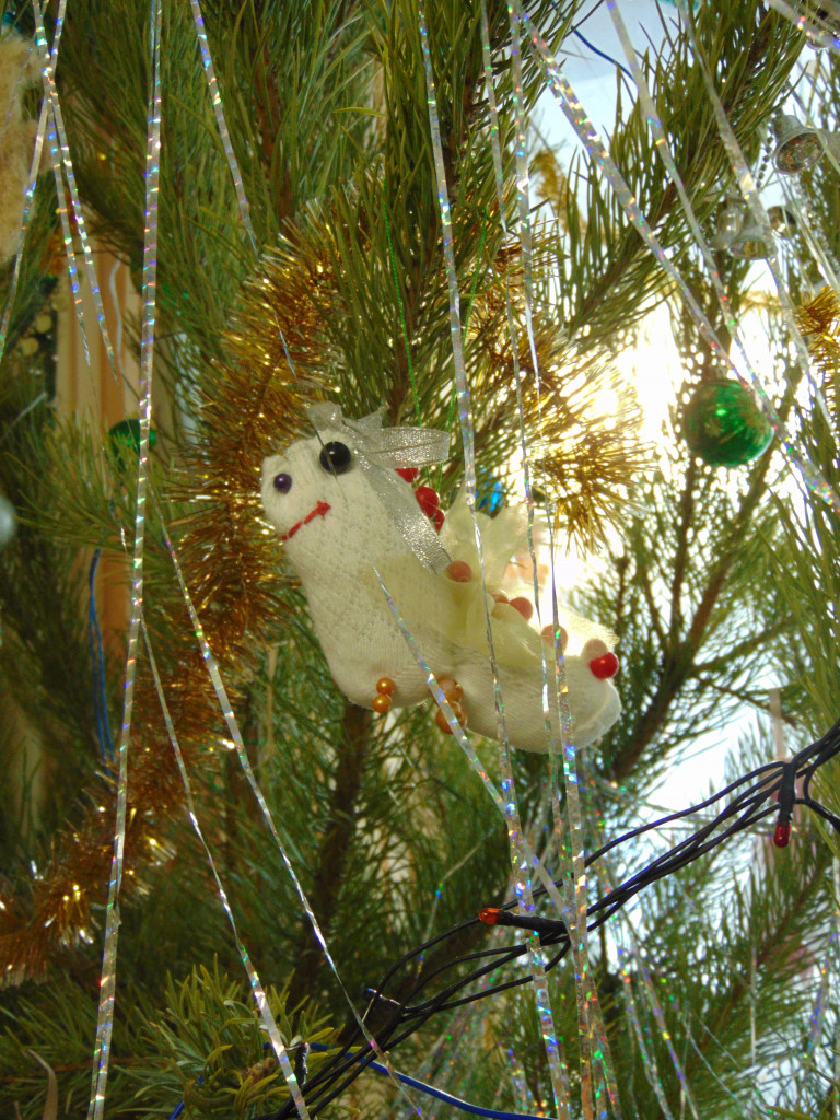 У меня на ёлке много рукодельных игрушек, ещё не помешает!!! А самая любимая - это дракончик из носочка, которого сын сделал в 3 года в Школе раннего развития, его мы вешаем на самое почетное место!