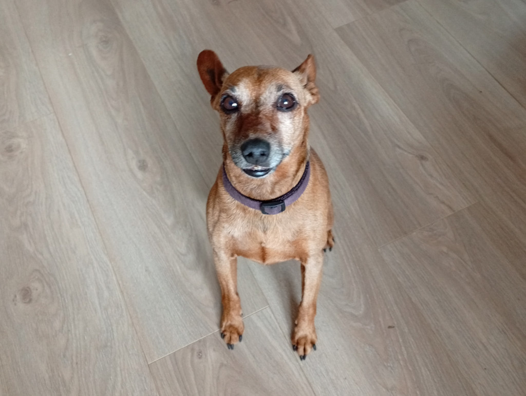 Карликовый пинчер Риччи, уже старичок, зубки шатаются, седой стал, бедолага.