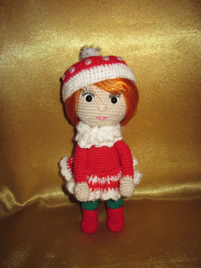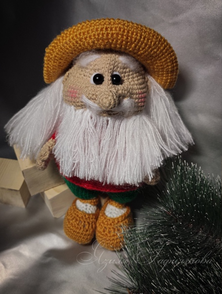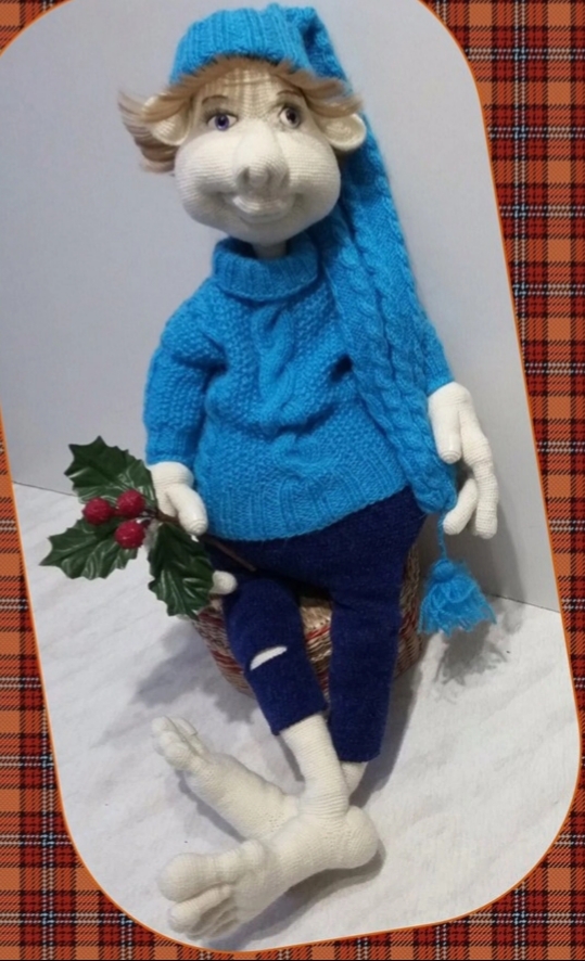 в ходе онлайна у Полиночки вот такая елочка-Гномочка у меня получилась.Связала я ее из пряжи Бисерная и Пчелка,а вот голова, ручки и туфельки распечатаны на 3д принтере