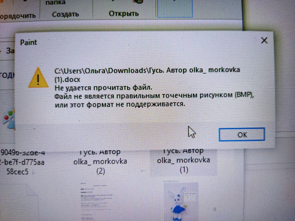 Судя по фотке ты его в Пайнте(Paint) пыталась открыть, а не в ворде,поэтому такое сообщение и выскакивало,если нет ворда то в каждой винде стоит стандартный Ворд Пад(WordPad)-по умолчанию- им можно спокойно открывать вордовские файлы.