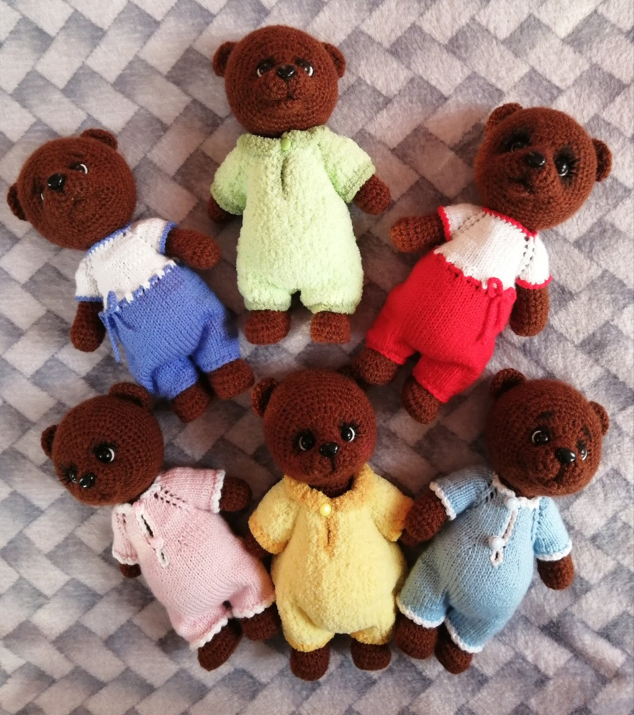 У меня тут уже собралась коллекция.. 51 медведь был связан за 1,5 года по описанию мишки в пижамке. Примерно треть из них были мишками для работников скорой помощи. Я старалась не повторяться в костюмчиках, так что, если не считать мишек медиков, то я, скорее, дизайнер мишечной одежды.