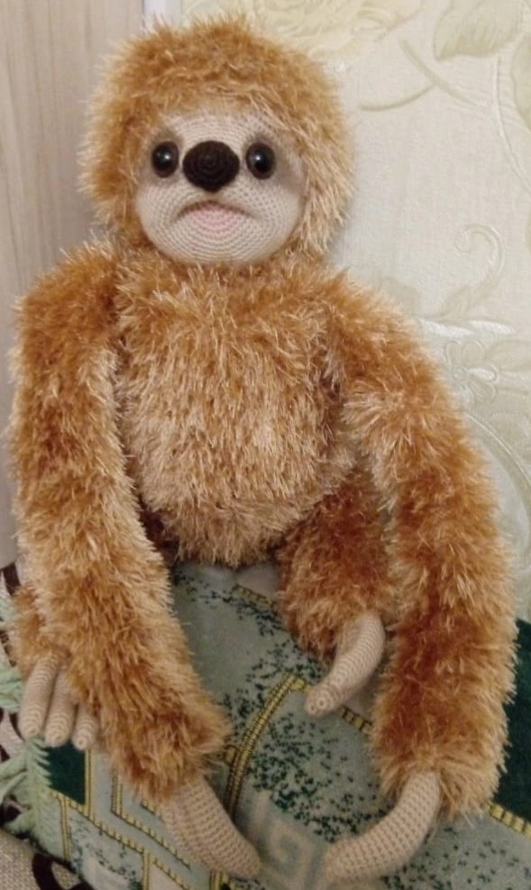 Сластёна, спасибо Марии Устюшкиной. Связан крючком из пряжи пехорка детская новинка. Ножки и голова на шплинтовом креплении, в ручках проволочный каркас. Рост стоя - 25см, сидя - 20см.