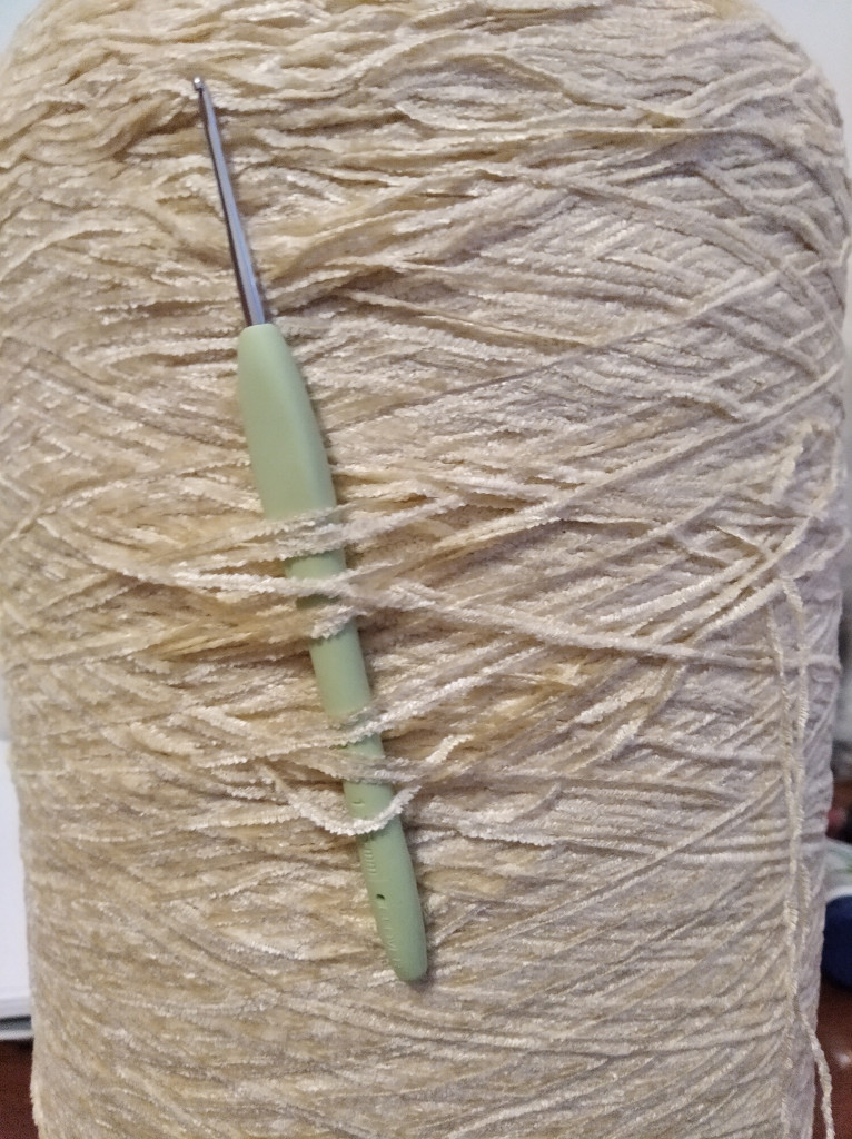 Есть еще вот такая синель или по другому называется, фактура у пряжи плоская, состав вискоза и хлопок. Вяжется хорошо, петли видны, не осыпается,метраж не известен, нонитка тонкая, я вязала крючком кловер амур 1,75, 1,5. 150руб/50 грамм, цвет золотистый-ванилька