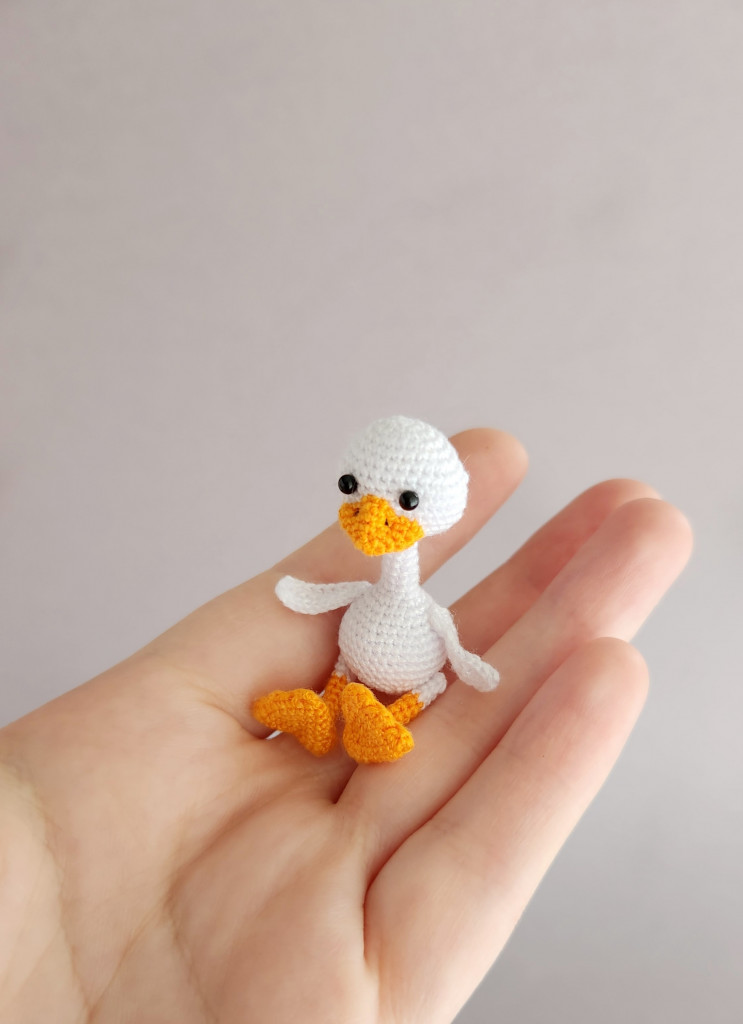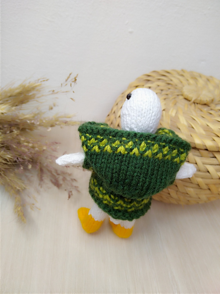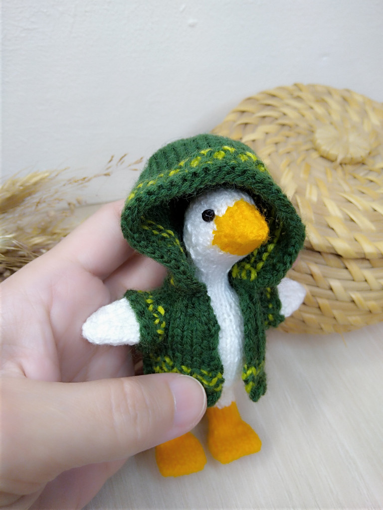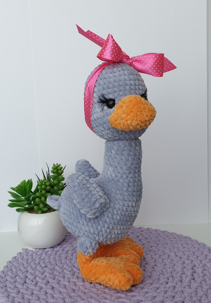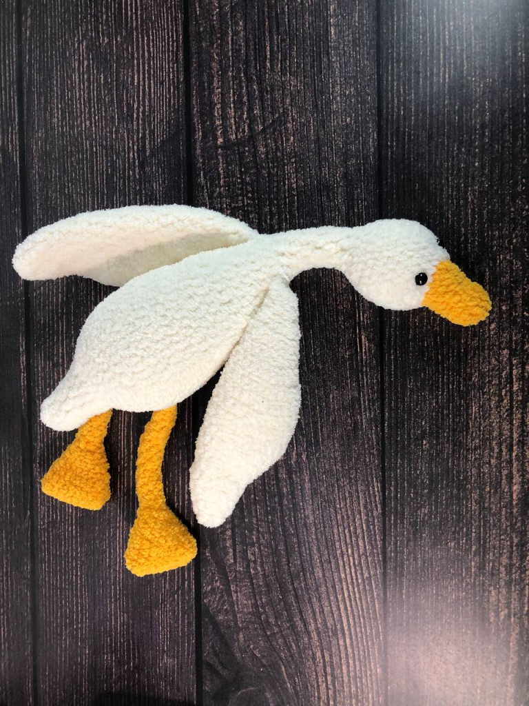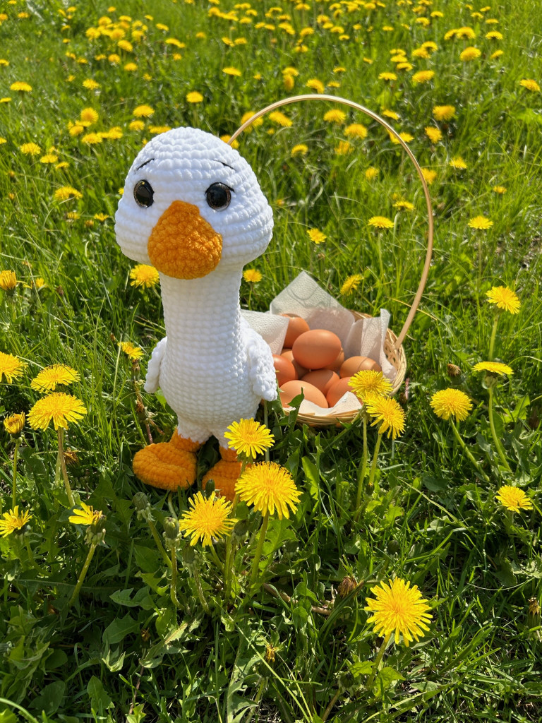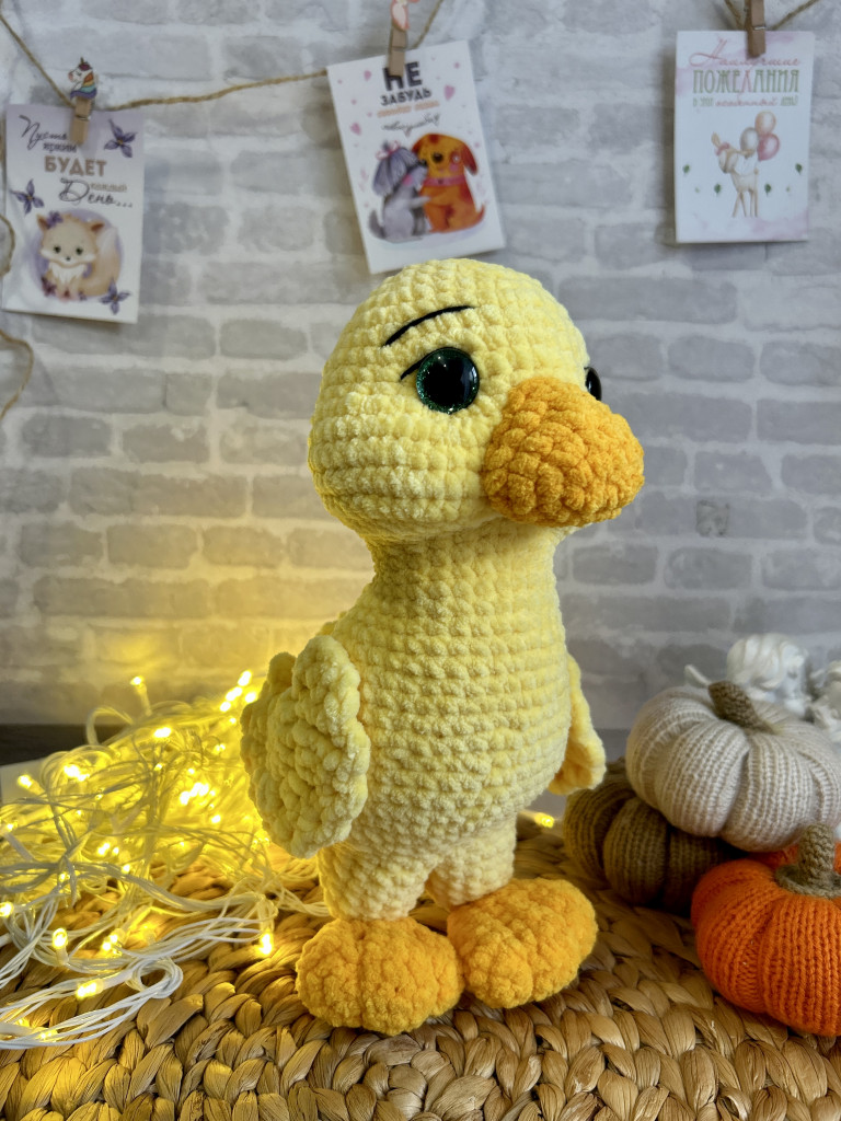 Малышка связана из детской плюшевой пряжи. Глазки на безопасном креплении. Голова поворачивается (крепление: пластиковый сустав). Лапки армированы (проволочный каркас), что позволяет игрушке самостоятельно стоять. Рост гусёночка около 25 см. Игрушка комфортна для детских ручек.