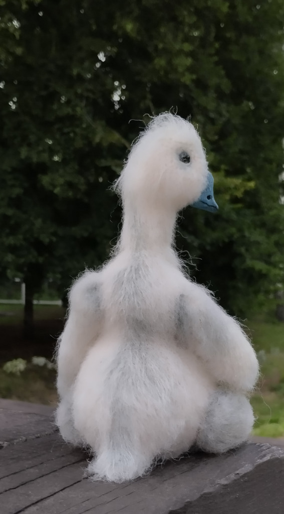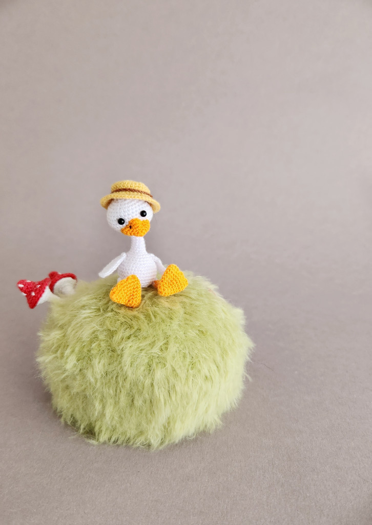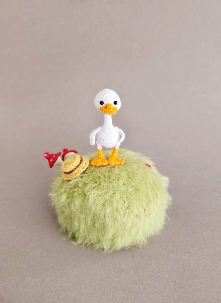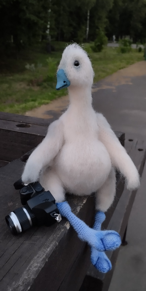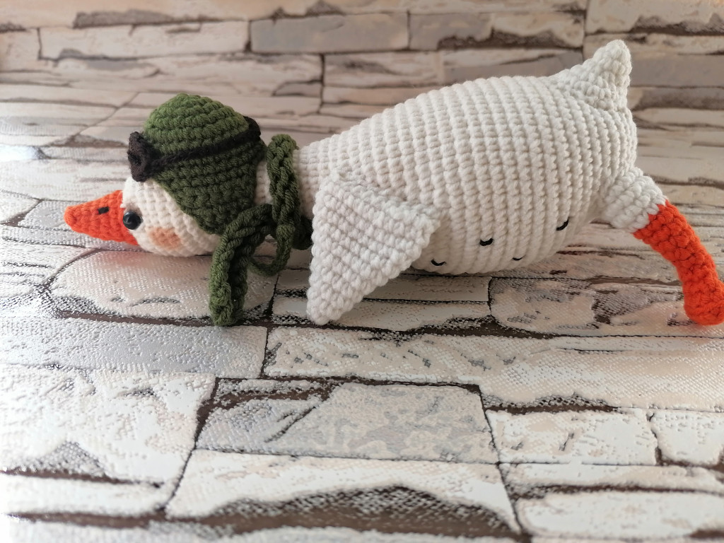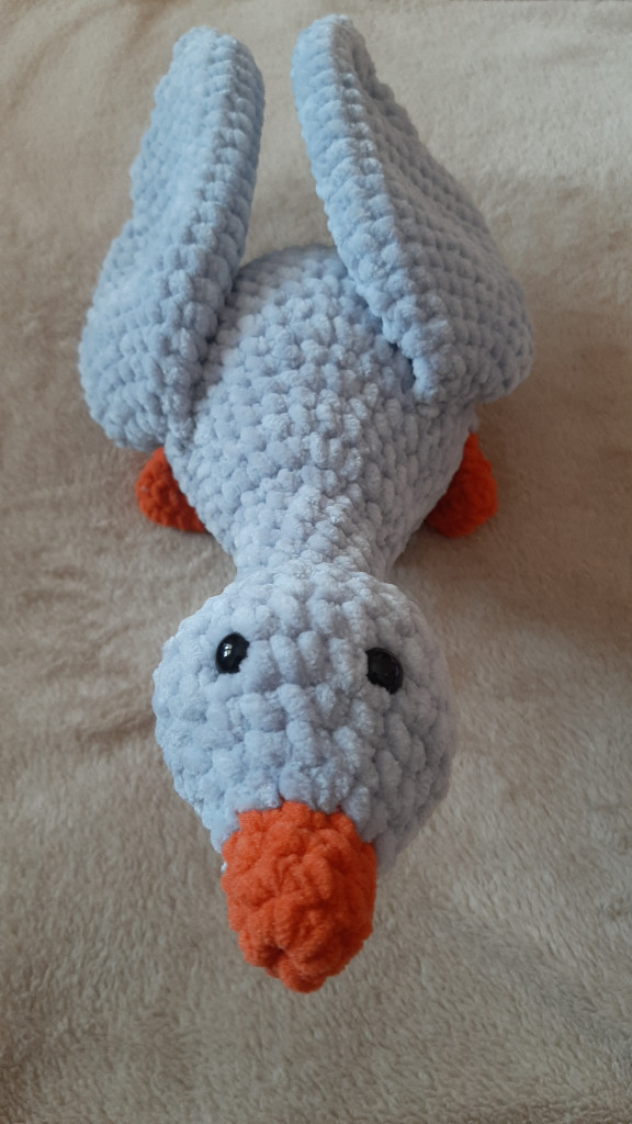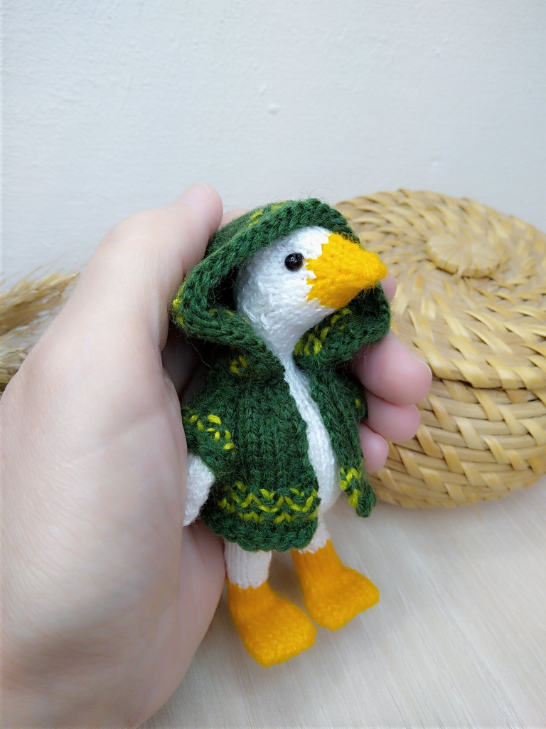 Малышка связана из детской плюшевой пряжи. Глазки на безопасном креплении. Голова поворачивается (крепление: пластиковый сустав). Лапки армированы (проволочный каркас), что позволяет игрушке самостоятельно стоять. Рост гусёночка около 25 см. Игрушка комфортна для детских ручек.