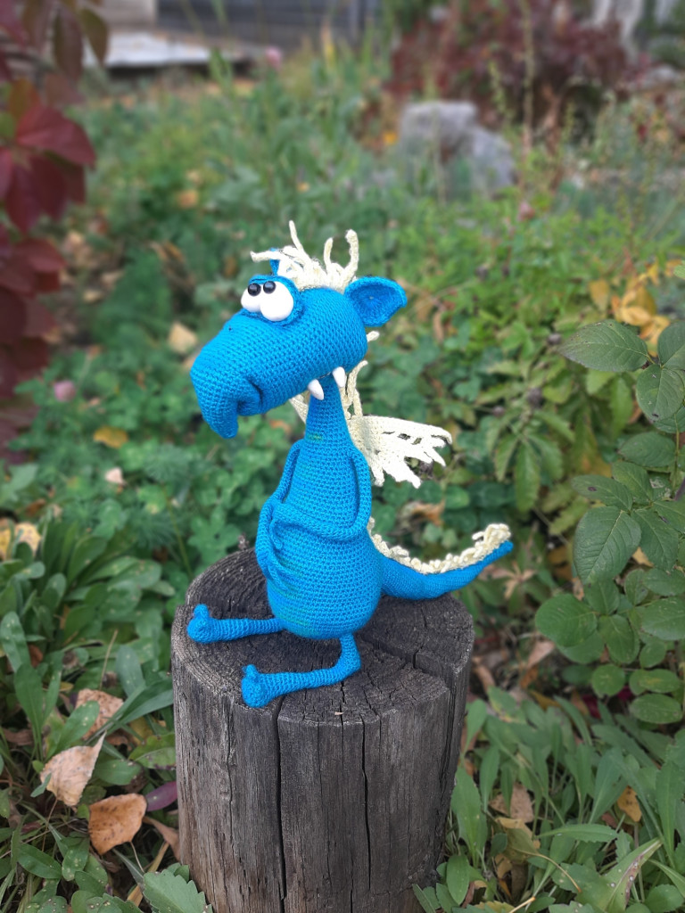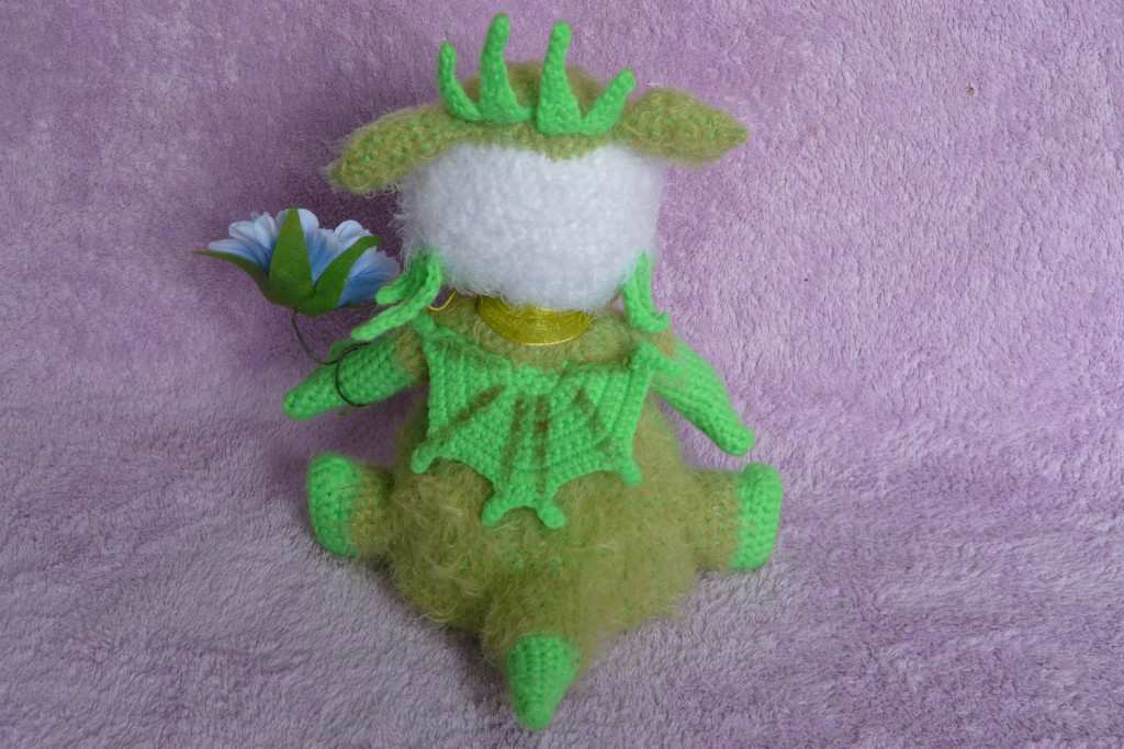 Из последних, как раз то что сейчас модно. Дракоша-кроха, связанный в технике поворотные ряды на совместном вязании