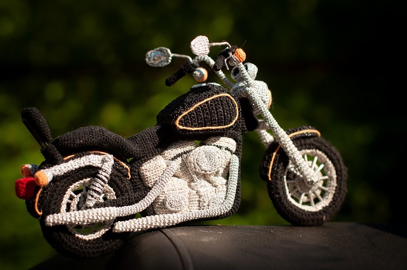) Но результатом довольна, да) Это мини-копия нашего мотоцикла Harley Davidson Dyna Super Glide. Состоит примерно из 87 вязаных деталей (спицы, рычаги не учитывала, только то, что связано)