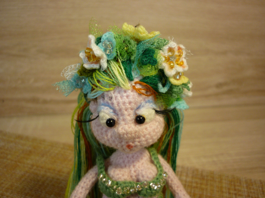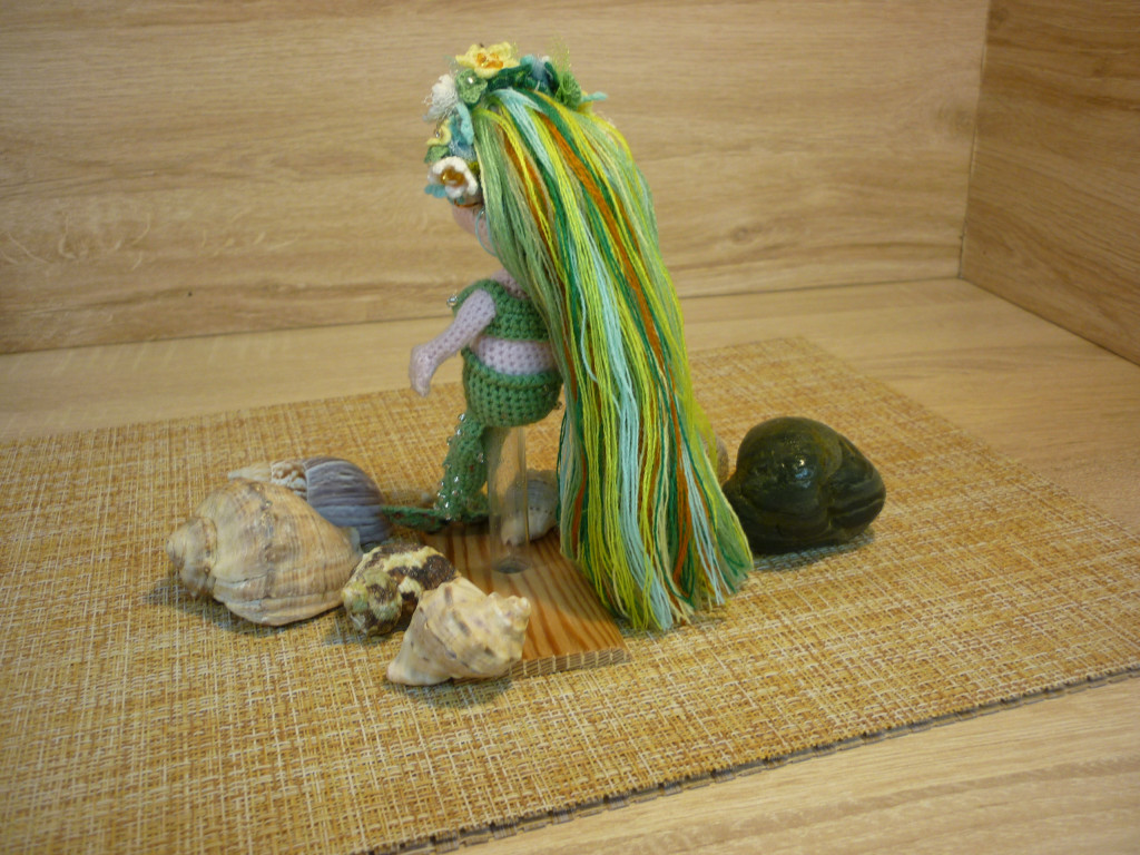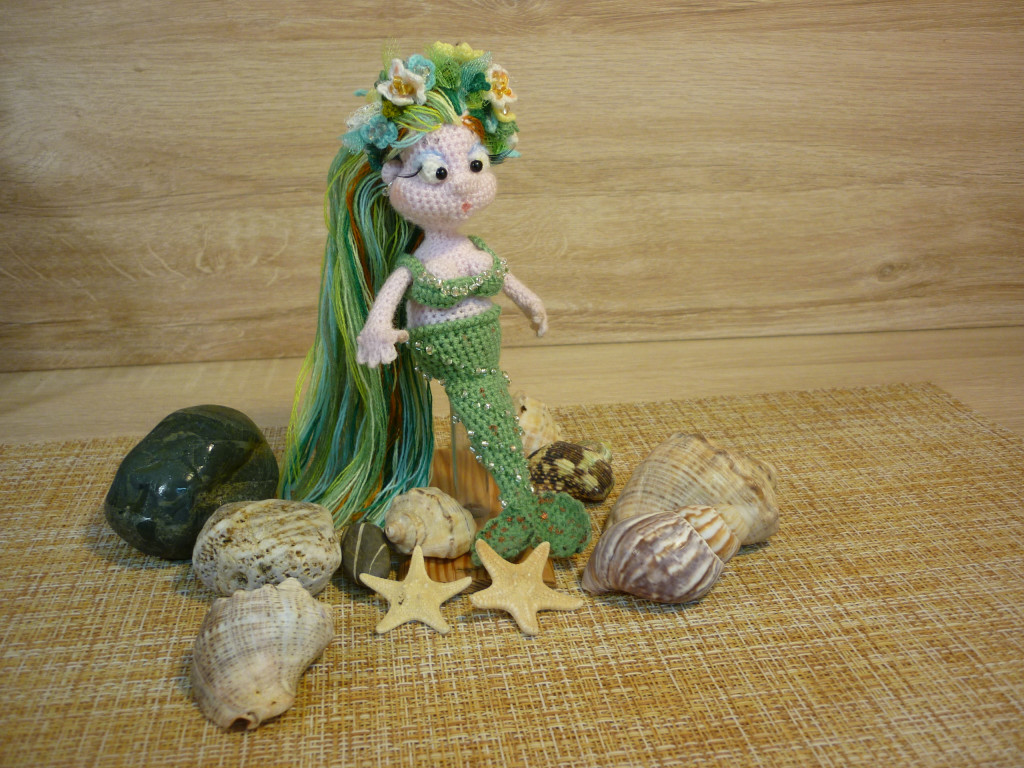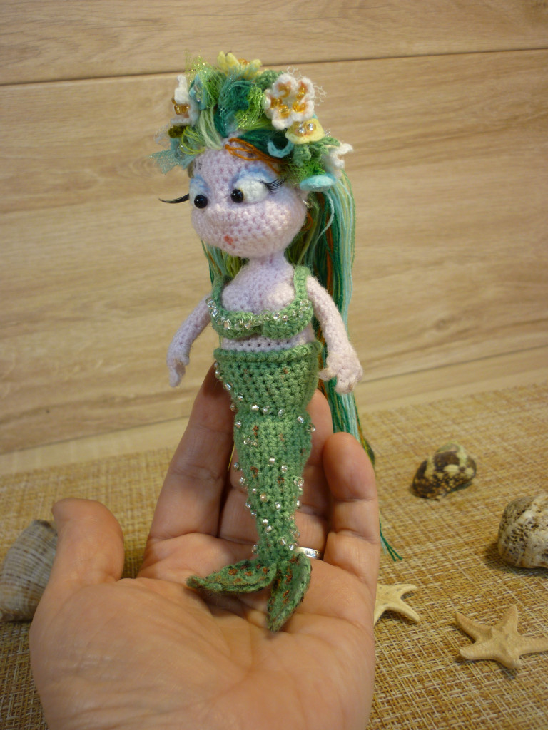 Связана русалка из полушерсти в две нити, это бобинная пряжа для вязальных машин. Крючком кловер №0,9. Размер русалки 15 см.