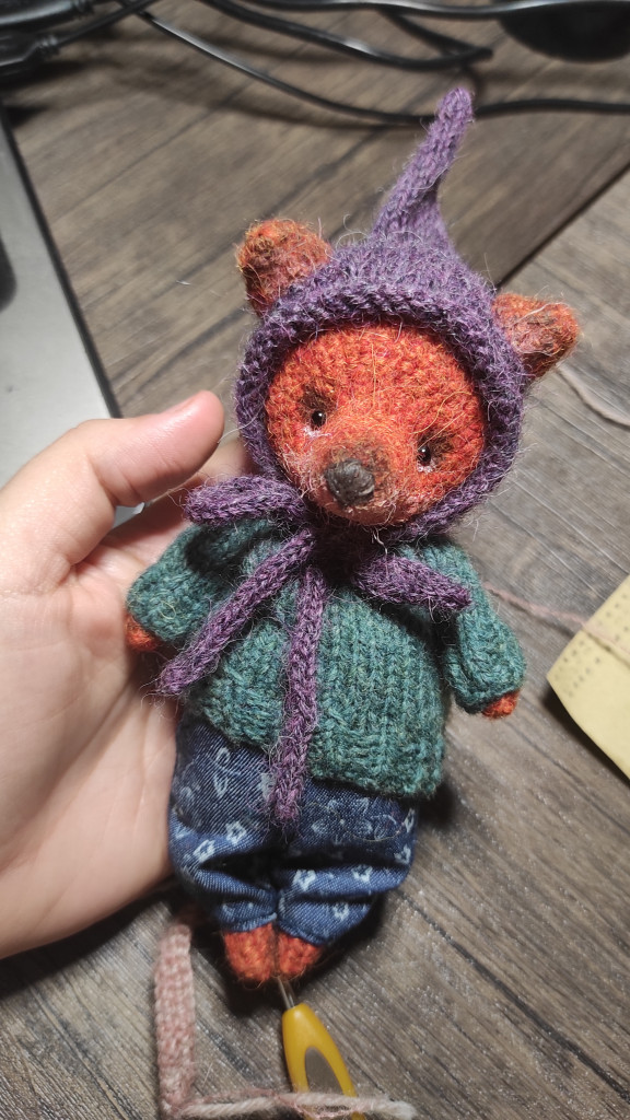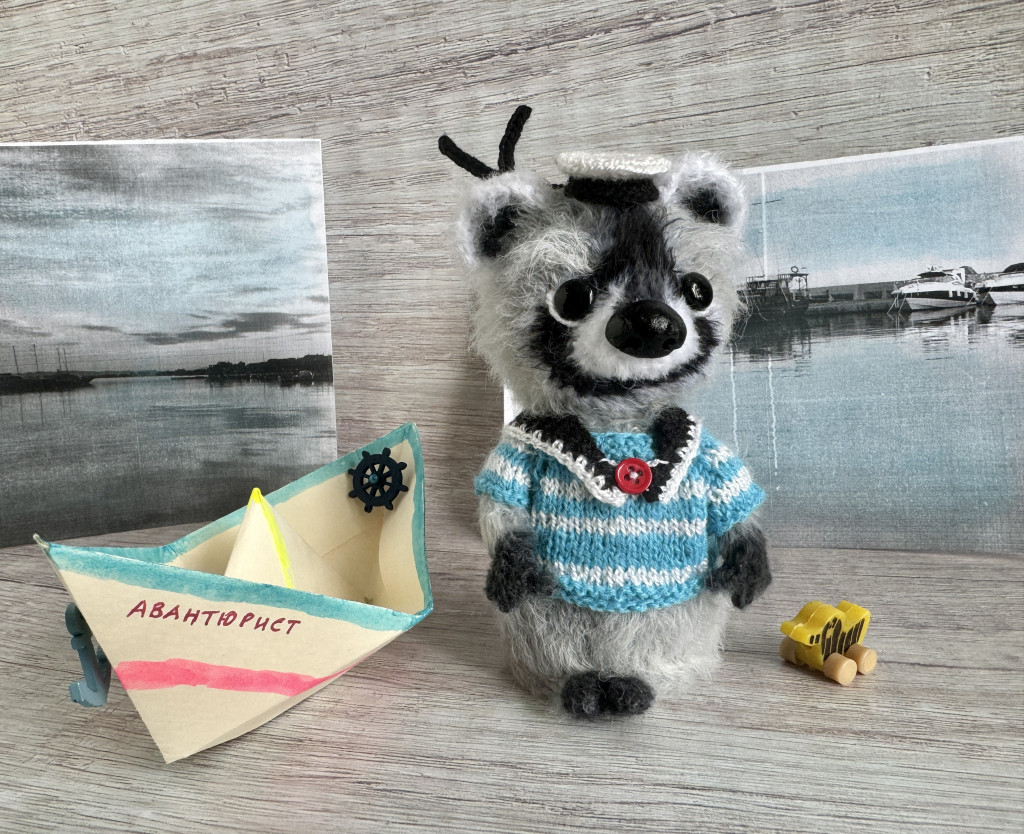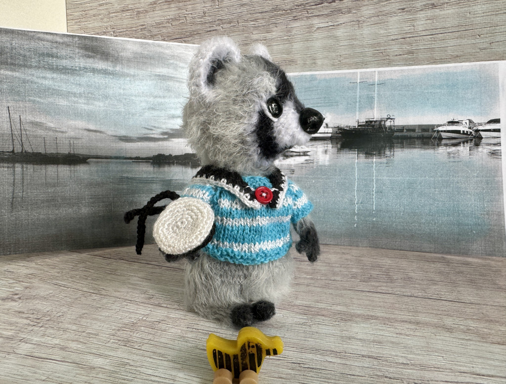 Енотик Сеня, спасибо Светлане Комаровой. Связан крючком из пряжи ХТ, одежда связана спицами из пряжи пехорка детская новинка. Все детальки ввязаны, голова на шплинте. Размер 14см.