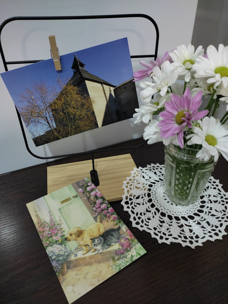 Мини открыточки и наклейки, и красивые цветы.