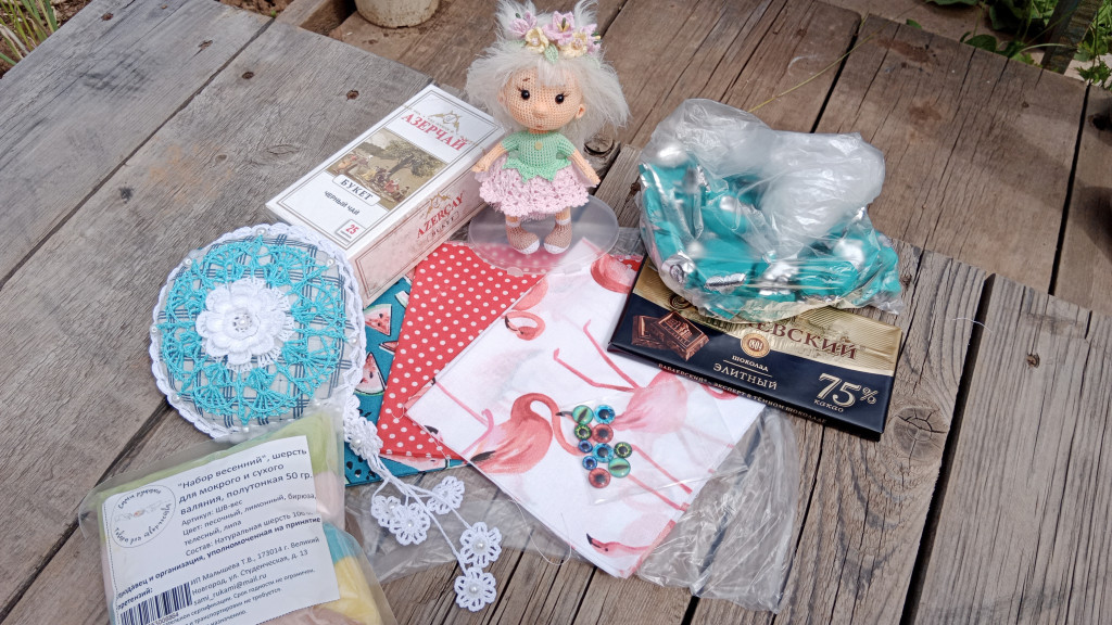 не менее невероятная игольница, обвязаная тоненькими ниточками. Я такими уже не могу вязать даже в очках. Мои любимые шоколадные конфеты с мятой и горький шоколад. Чай муж сразу конфисковал себе на работу. Набор шерсти для валяния,а какие нежные там цвета :adore: Тканюшки, причем весьма кстати,скоро пойдут в дело