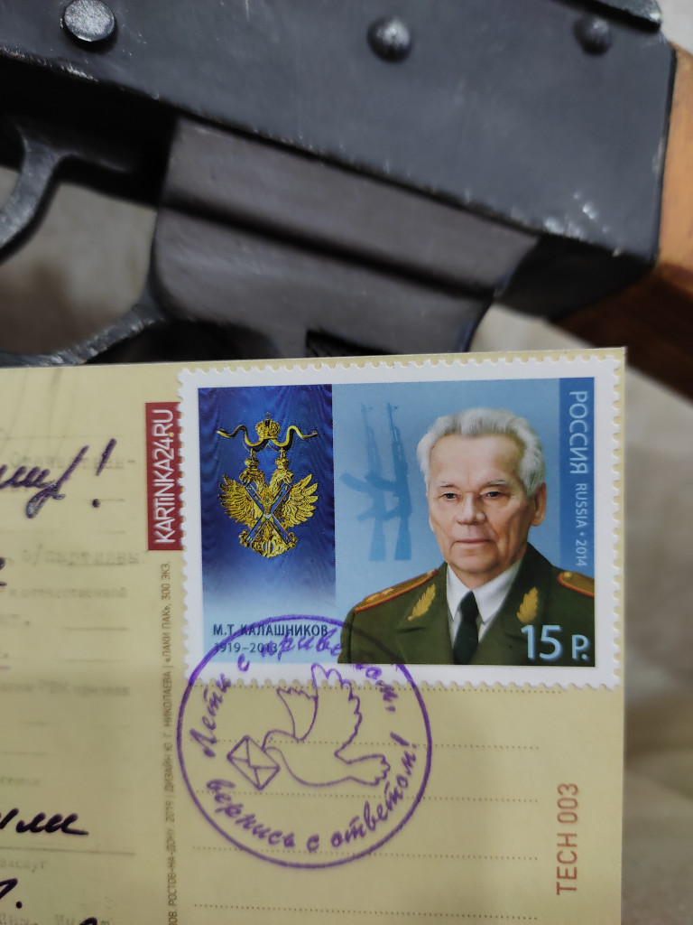 А у меня вернее у нас зимний приветик от Юли @Просто мама !!! Для меня милейший котяра на коньках, А для мальчиков - открытка портрет М. Т. Калашникова! И марка на открытке такая же! Юля, огромное спасибо от сына, ведь он фанат этого оружия, его макет уже завоевал столько наград! Спасибо преогромное!!!
