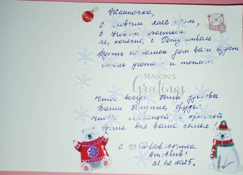 Светик я так рада что открыточка успела прийти до Нового Года!sweta08 писал(а): ↑23 дек 2025 15:42 @Taticrimea , @Почтискрыльями , @n-maks1965 девочки, ваши конвертики получила, открою на новый год. Спасибо огромное!![]()