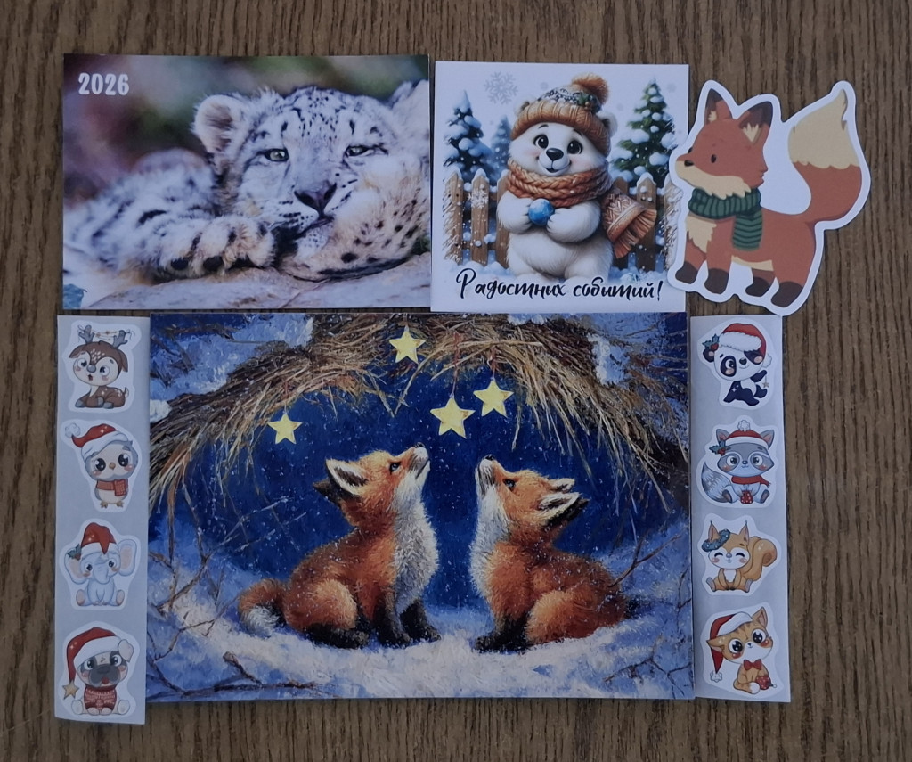 красота - любимая открыточка с лисятами, календарик, наклеечки. Оленька, все в целости, все очень- очень понравилось. Спасибо оргомнейшее!