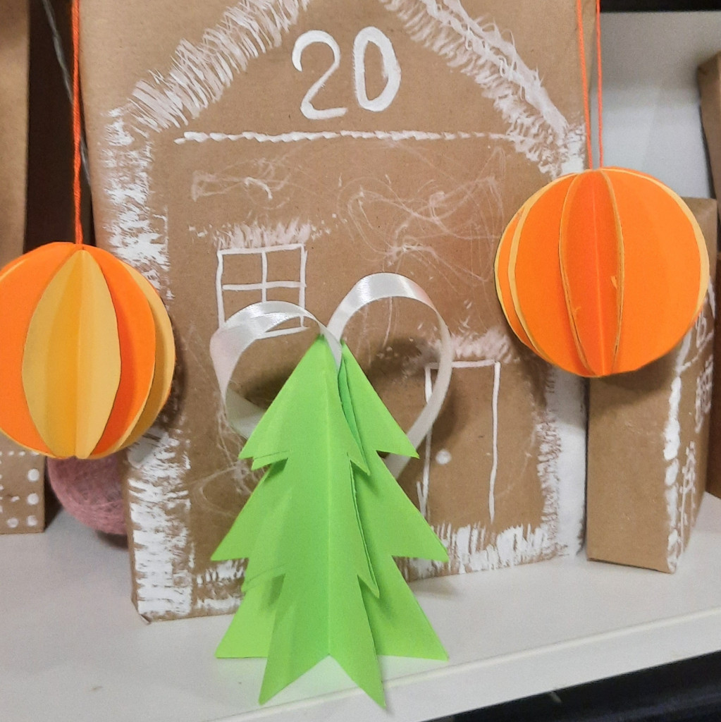 У нас вот такие шарики и елочки наклеились) каждый день с Максимом что-нибудь клеем да режем в его адвенте) И как удачно задания совпали)