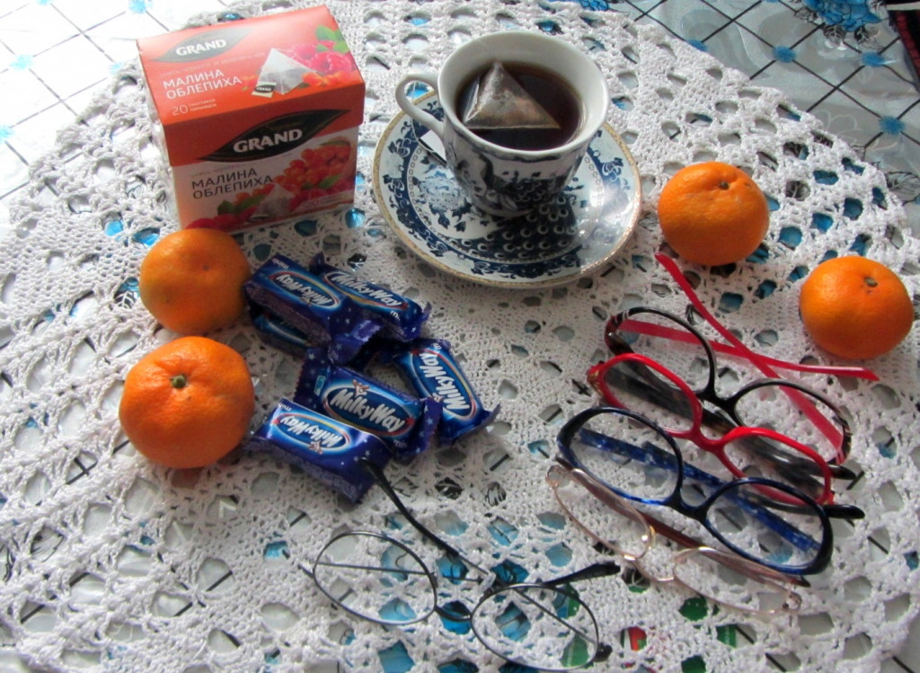 Чай купила. Понравился яркостью:коробочка нарядная,ягодки вкусные)) Я чай любой пью с медом и молоком. Иногда с конфеткой. Я не чаеман. А это очки собрала, которые нашла. Выкинуть их хотела, но у супруга зрение - как раз мои очки! Свои он бережет, а вот в моих старых - ремонтирует. Они у него в ходу)) Если что, это не все очки, это- которые попались. Те , что в середине - они правильные)))