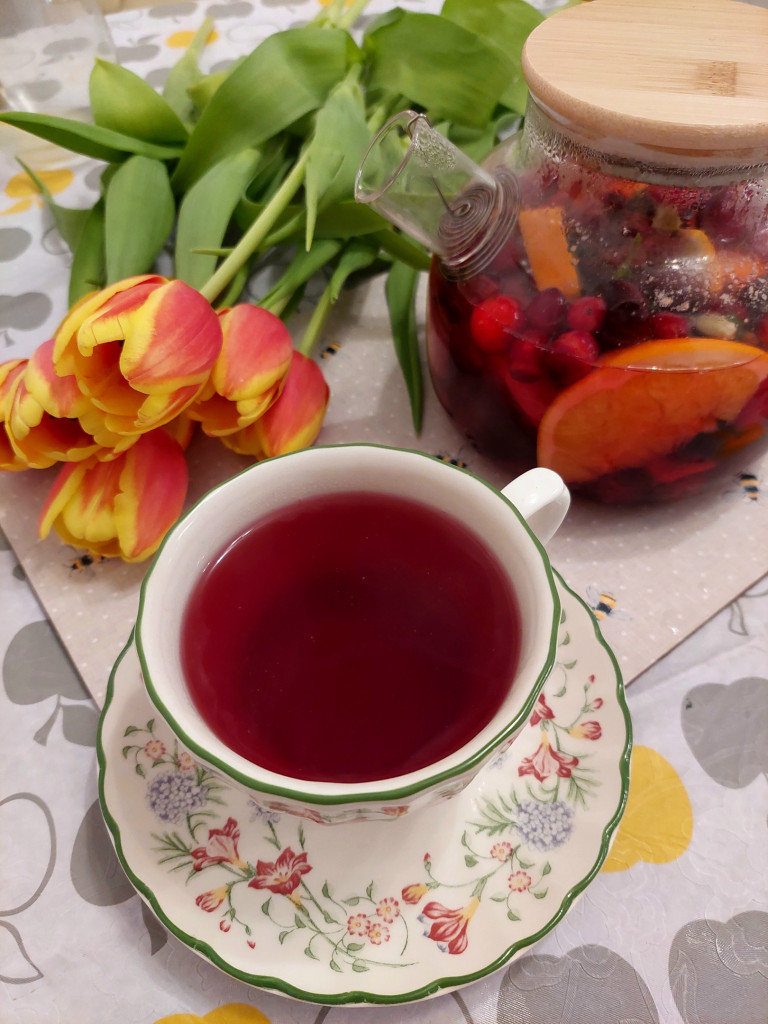 Чай! Буквально на днях захотелось мне какого-то зимнего чая :-)) и я смешала замороженную вишню, свежую клюкву, апельсин, веточку свежей мяты и кардамон! Можно еще мед, но мне нравится кисленький. Третий день пью этот чай и других экспериментов пока не хочу:-)) Оооочень вкусно!