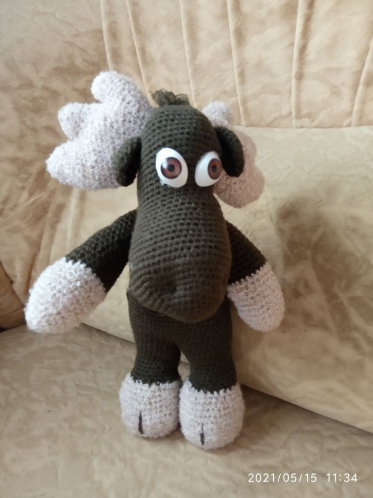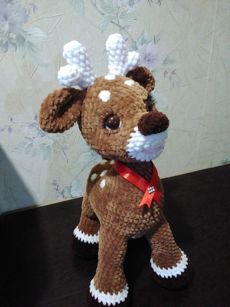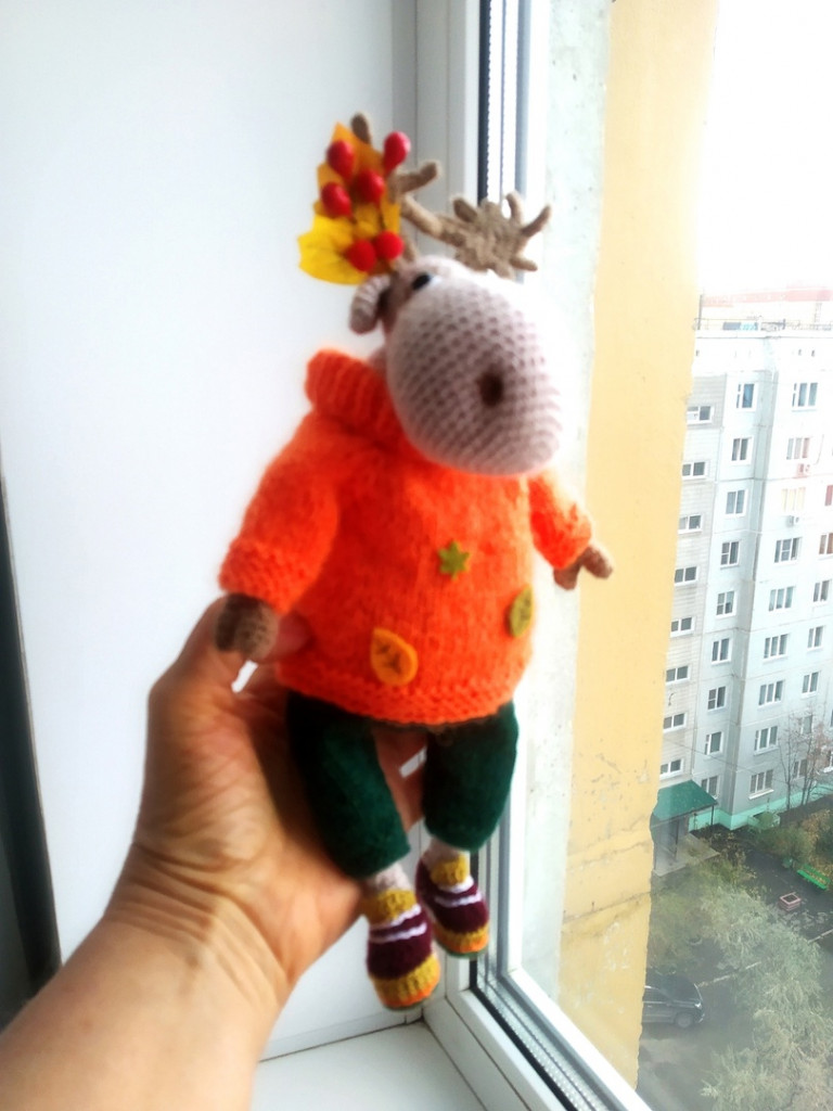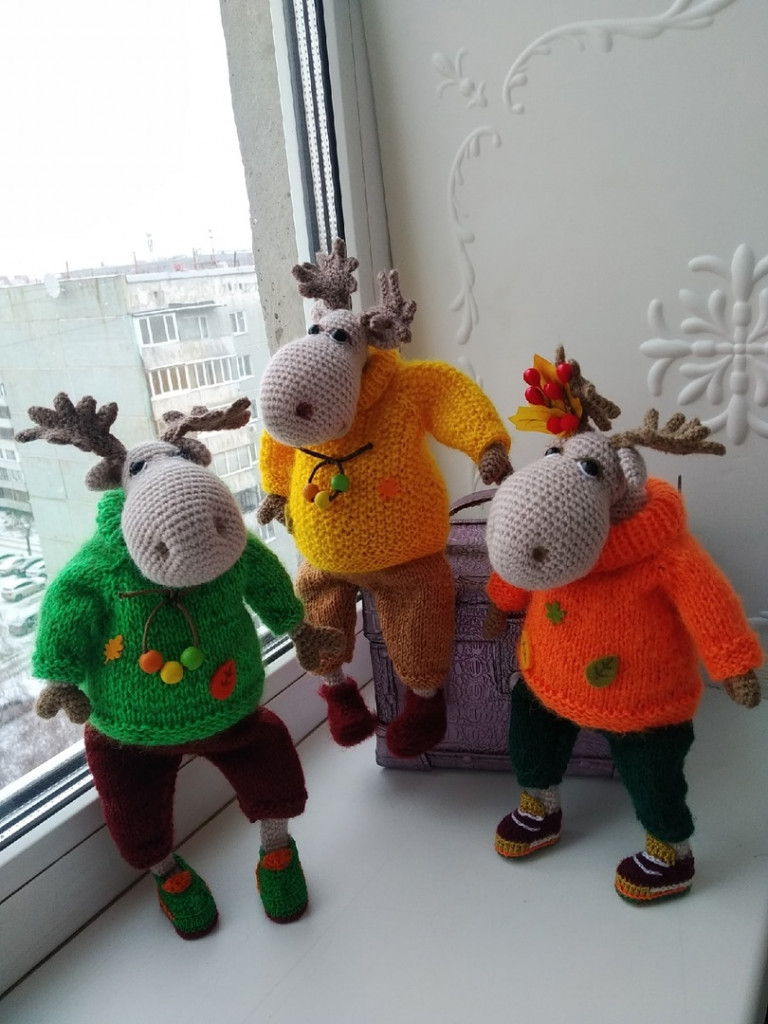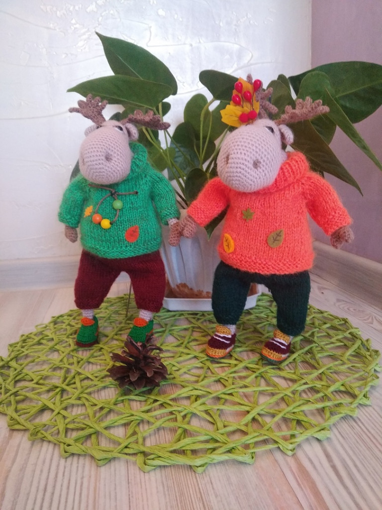 К Новогодним праздникам все готовятся заранее. Вот и я начала с осени. Кто же не любит лесных зверей. Я их обожаю. Особенно лосиков. Однажды летом на празднике Дня города я встретила живого лосенка! Боже!!! Не смотря на маленький рост у него были большие рога ! И бархатные! Нашла в ВК милого неповторимого лосика и навязала аж четыре...
