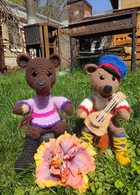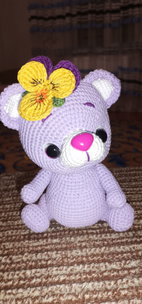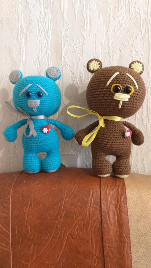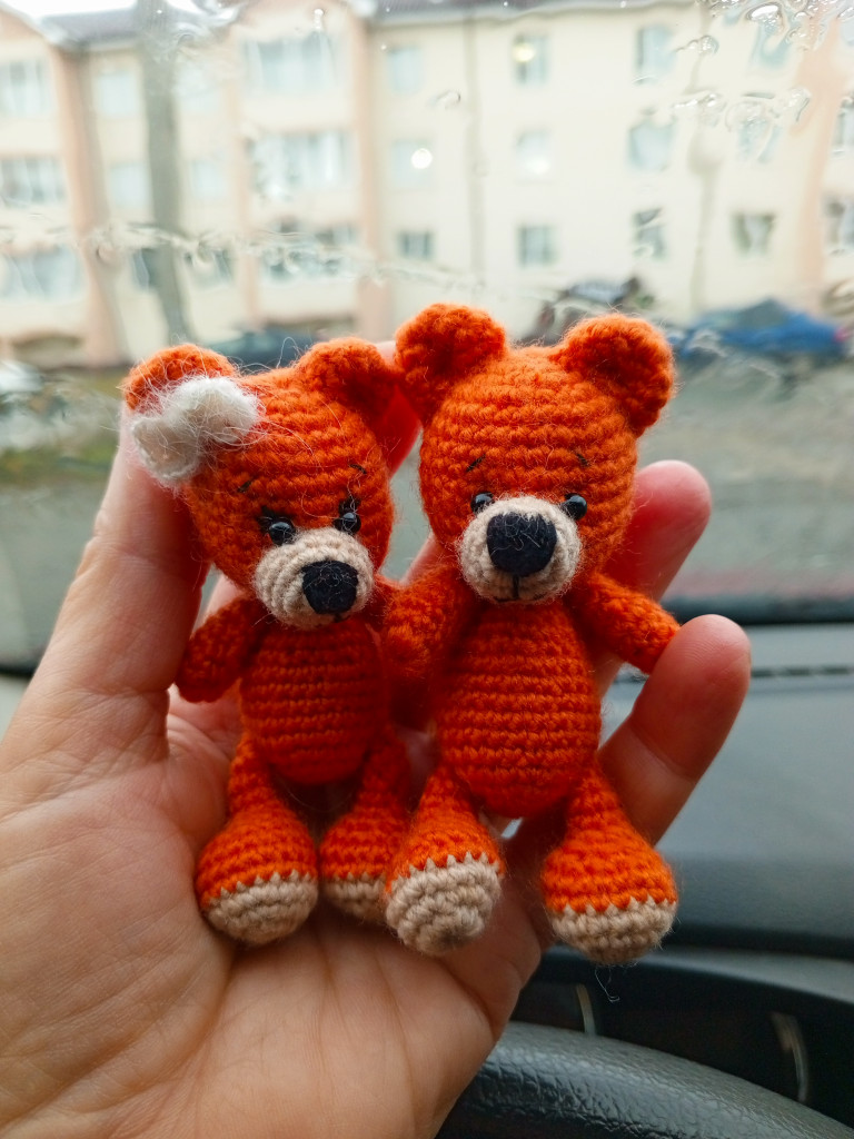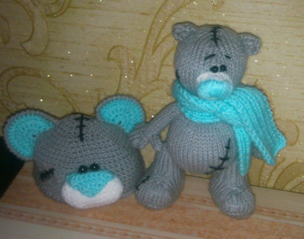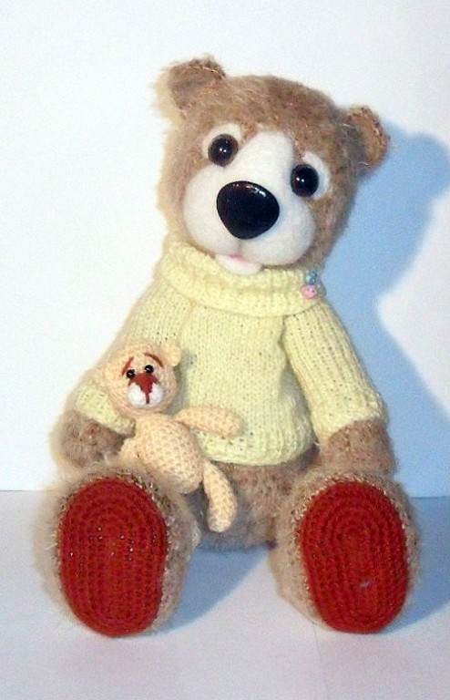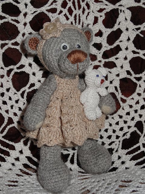 Я вязала брошку мишку и медвежонка. Это из последнего мной связанного. Мишутка размером 9 см. Люблю миниатюру :)
