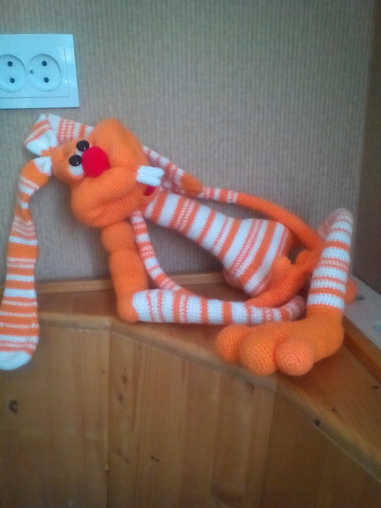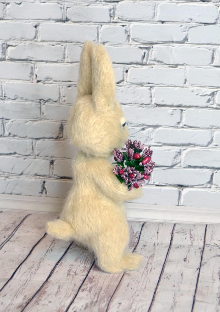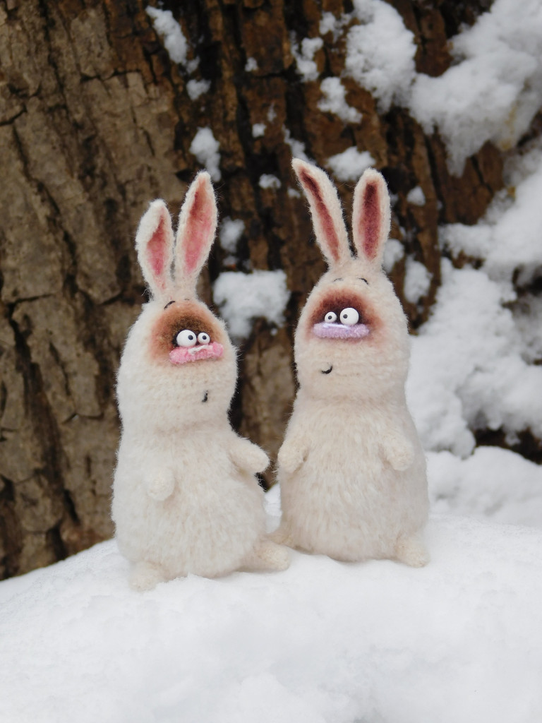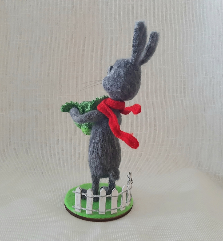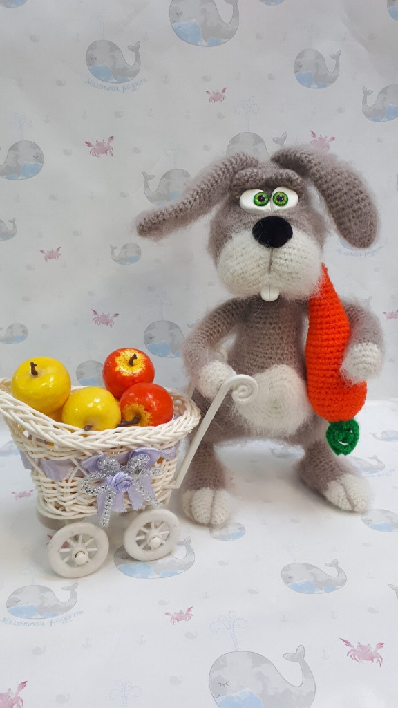 Пряжа Kartopy Pofuduk в 1/4 нитей, в пузе стеклянный гранулят, лапы на проволочном каркасе, ввязаны, тонировка масляными красками, зубы из запекаемой глины, морковь папье-маше. Рост без ушей 25 см.