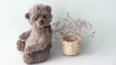 Связан из фактурной пряжи, набит холлофайбером, шплинтовое крепление. Самостоятельно сидит, стоит только с опорой.