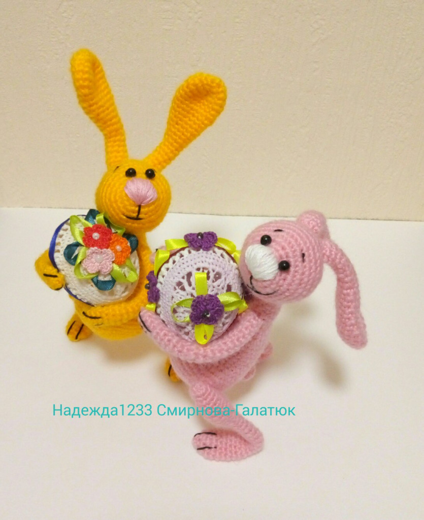 Зайки по мк Джованны Монфели, связан из неопознанной пряжи кр N1,25 кловер, рост 8,5 см