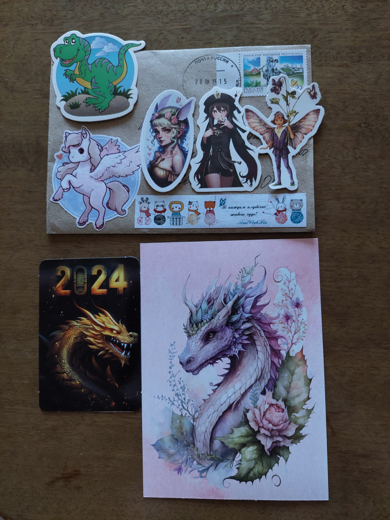 Получила замечательный конвертик по обмену от Наташи @totoshka . А в нём открытка с великолепным драконом, а оборот какой красивый.)) Ещё наклеечки в тему и календарик с драконом. Сам конверт тоже красиво оформлен. Я теперь и конверты, девочки, ваши собираю.