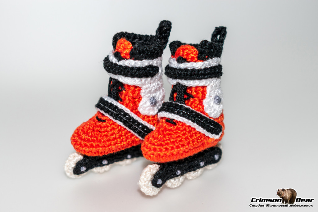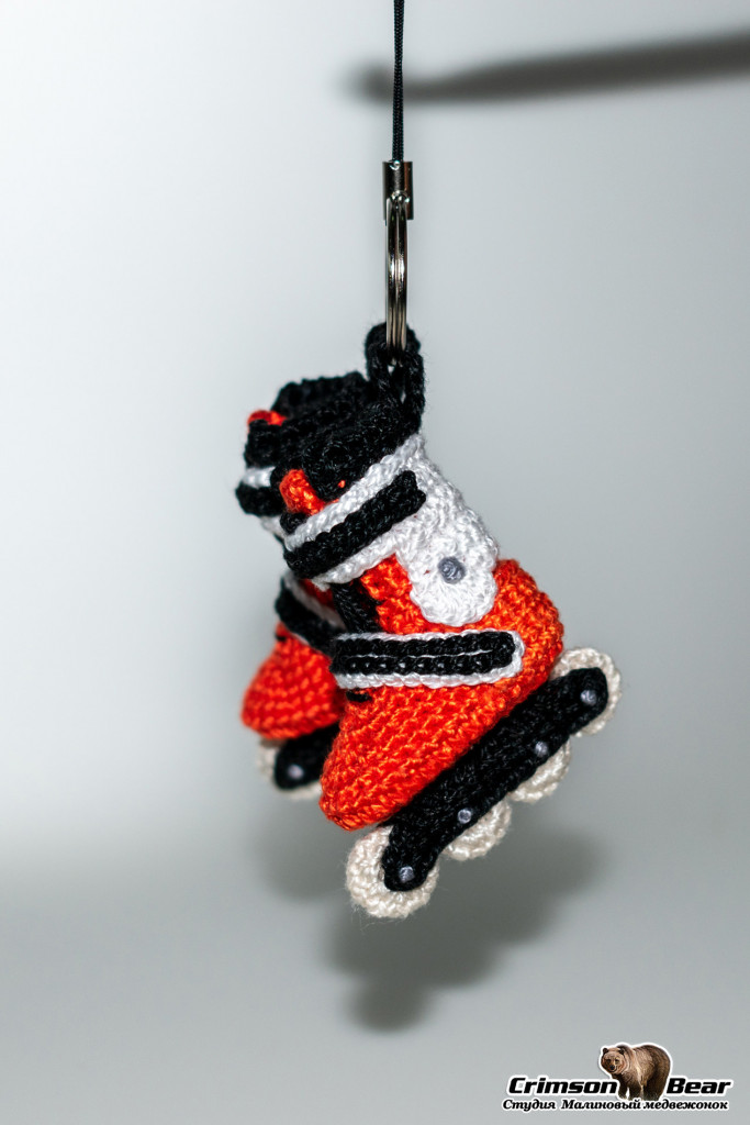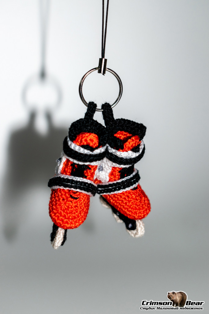 Брелок связан из хлопковой пряжи, подвес нейлоновая петелька на стальном 20-ти мм. кольце. Размер ботинка 5х4,5 см. Каждый ботинок состоит из 12 элементов.