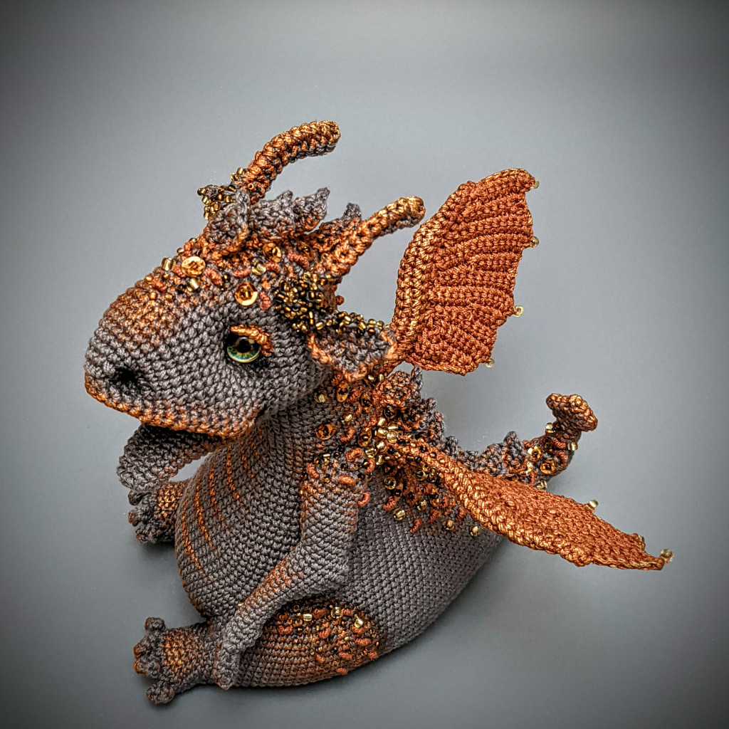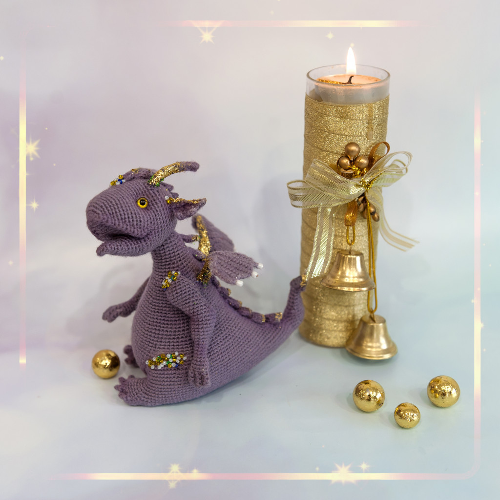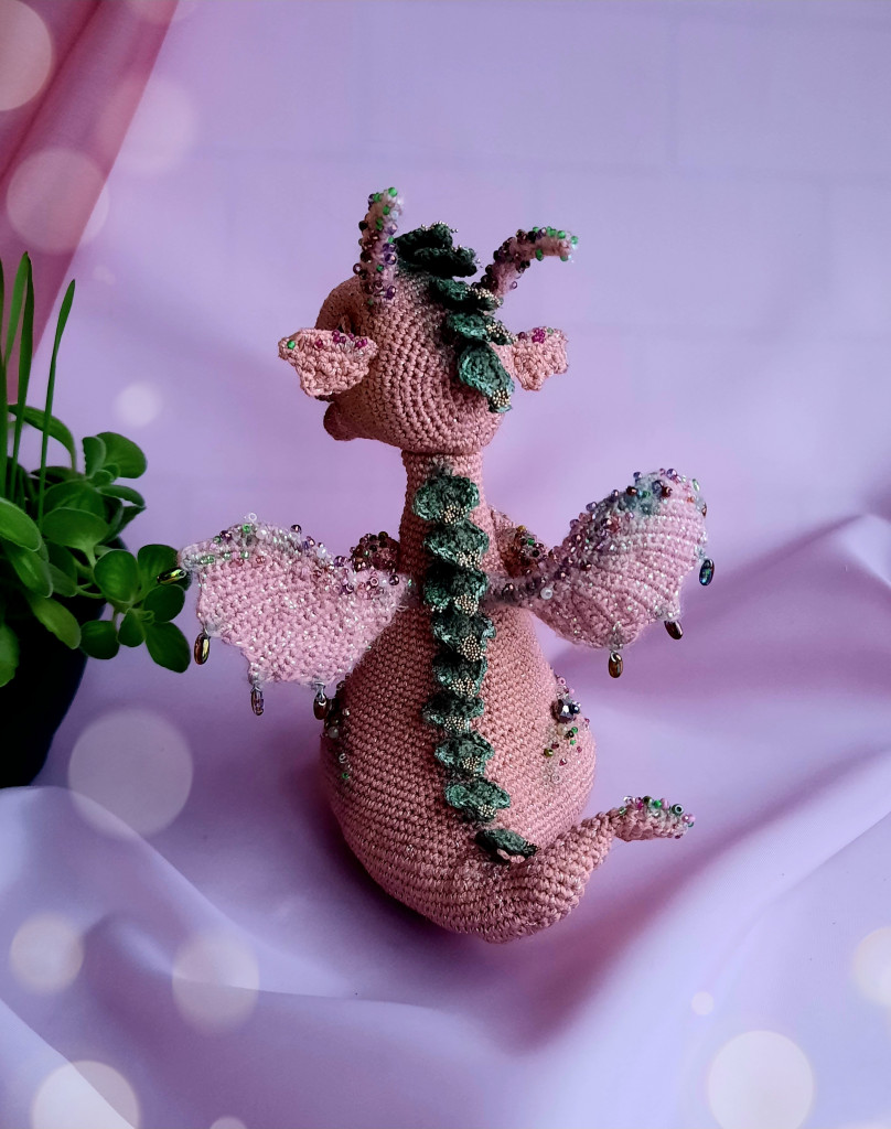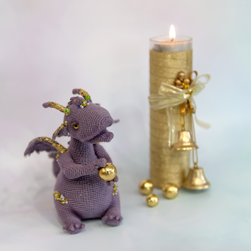 Связан дракончик из пряжи Alize Superlana Tig, 25% шерсть, 75% акрил, на 100г 570м, крючком 0.5 кловер Амур. Рост примерно 13-14 см без рожек. Передние лапки и голова на шплинтовом соединении, декорирован бисером, паетками и паталью. Паталь использовала впервые, очень увлекательно, жемчужинки тоже покрыты паталью))