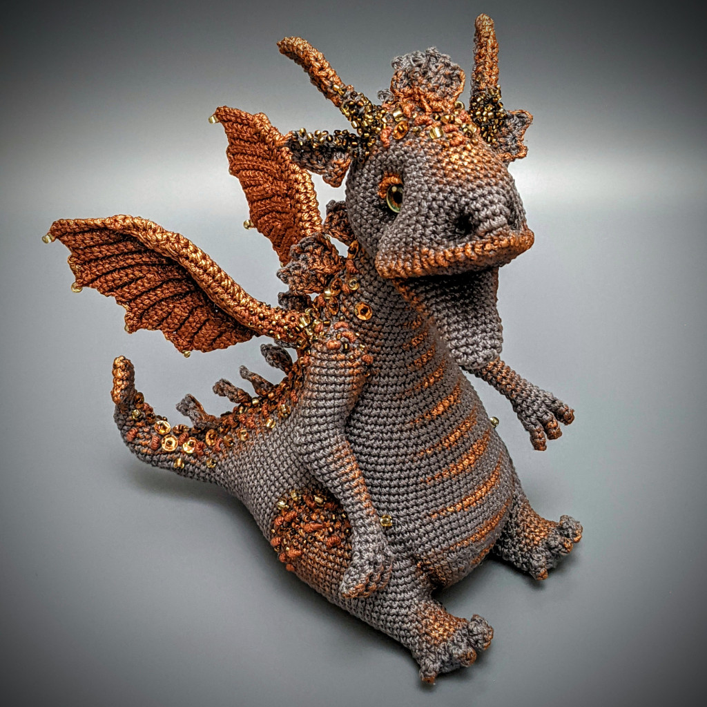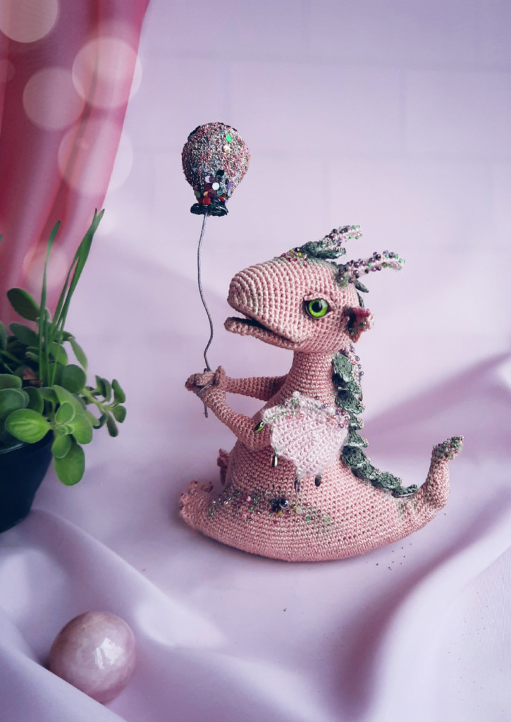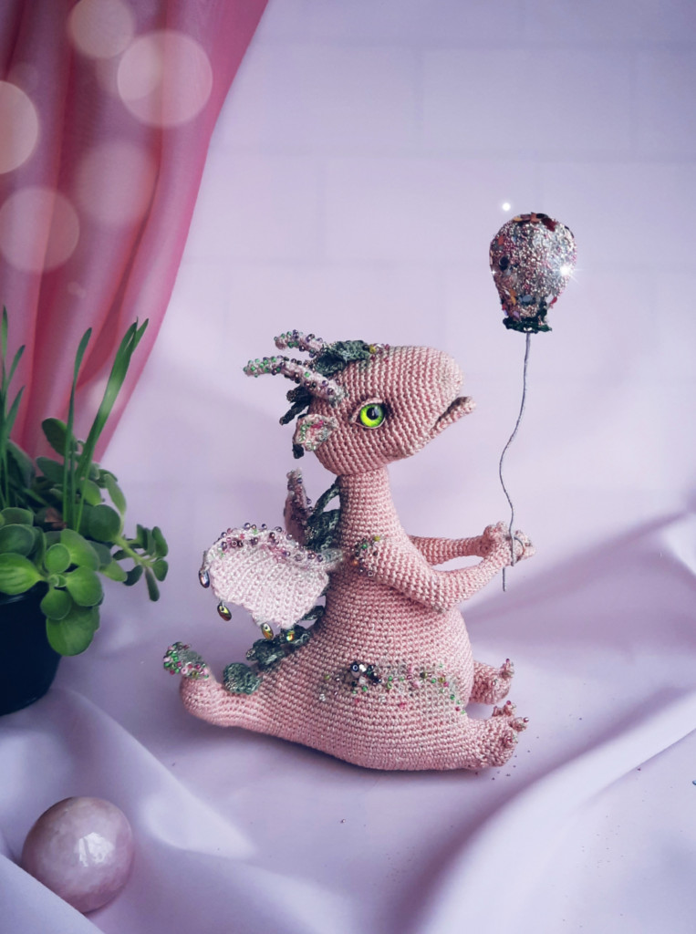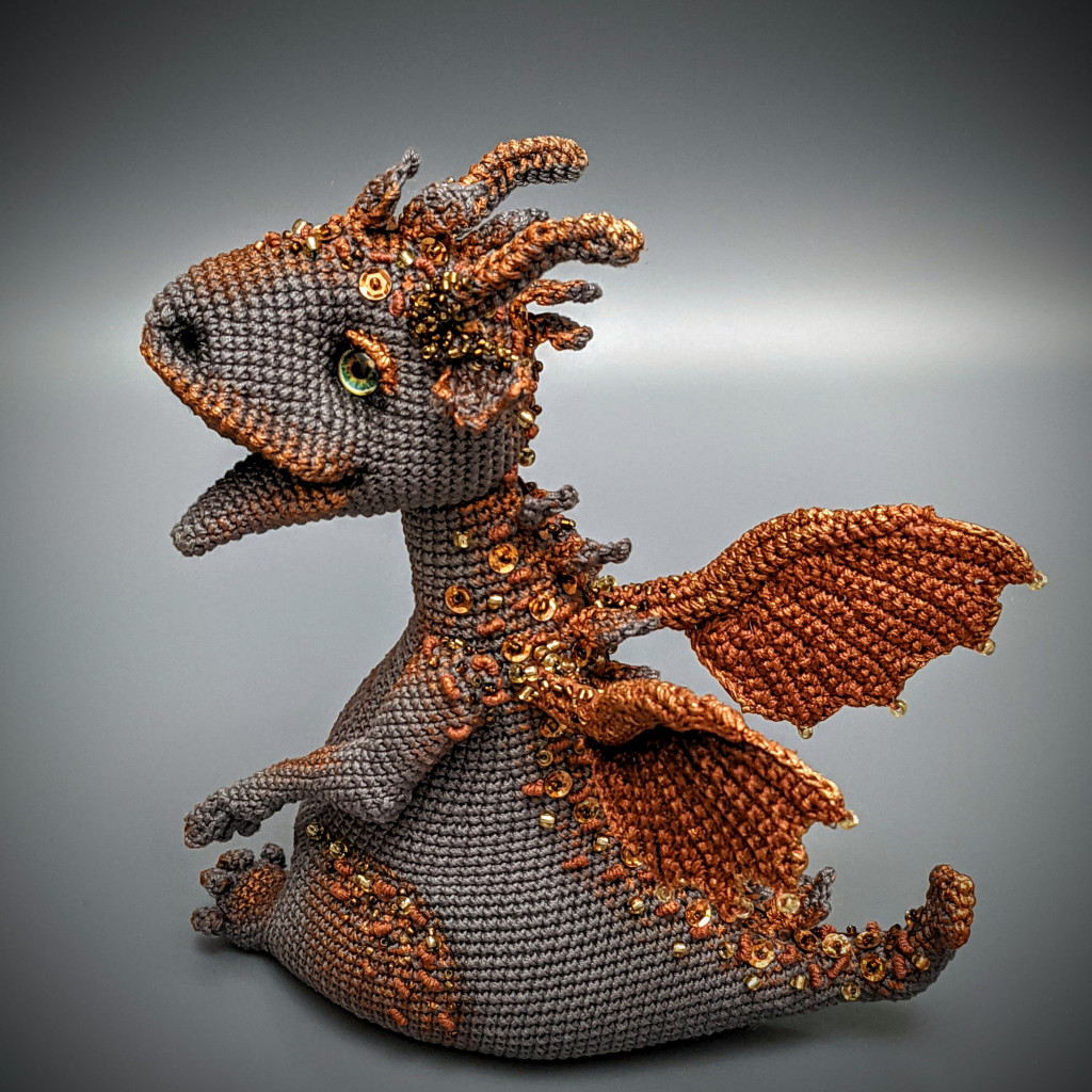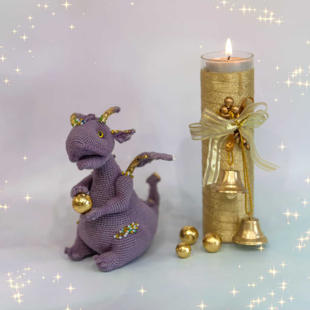 Связан дракончик из пряжи Alize Superlana Tig, 25% шерсть, 75% акрил, на 100г 570м, крючком 0.5 кловер Амур. Рост примерно 13-14 см без рожек. Передние лапки и голова на шплинтовом соединении, декорирован бисером, паетками и паталью. Паталь использовала впервые, очень увлекательно, жемчужинки тоже покрыты паталью))