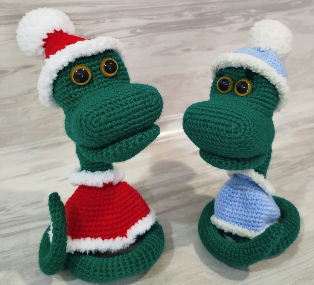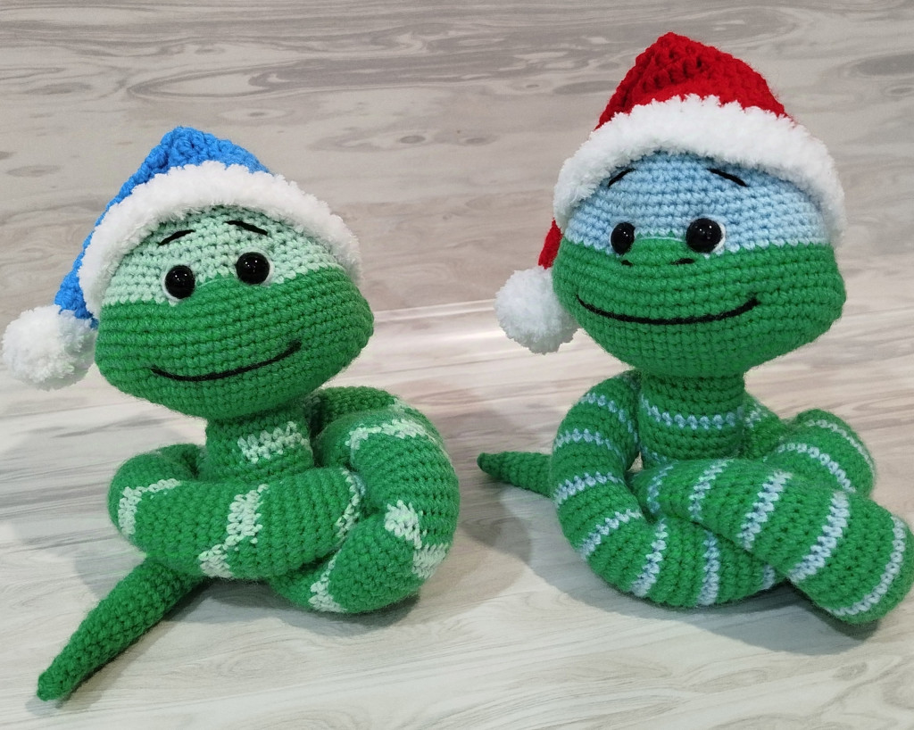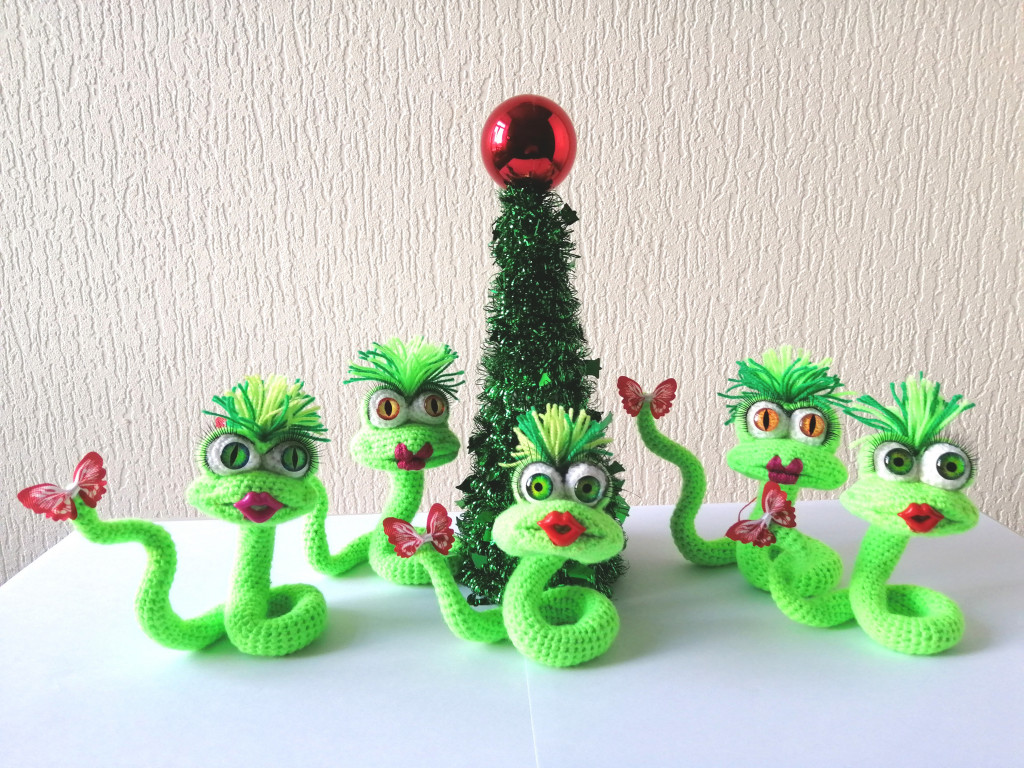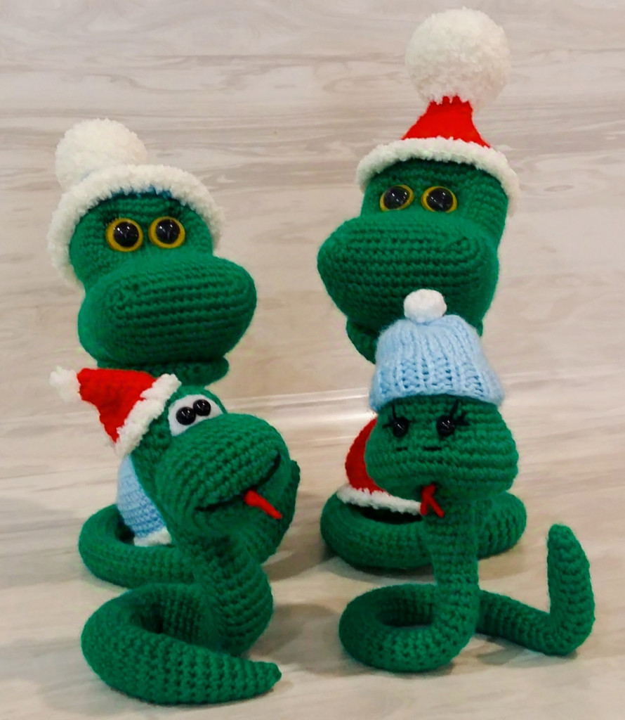 Змейка Ева, автор Антонина Дегтярева, 60 см, Змейка Анфиса (автор @mila_knitting_toys, 50 см), Новогодняя змейка (автор Янина Камышан, 25 см), Змейка (автор @Tato_toys, 25 см).