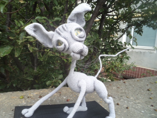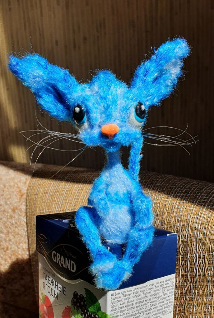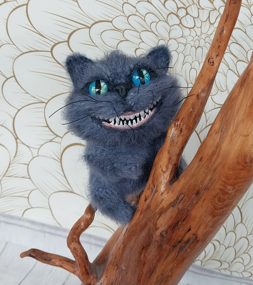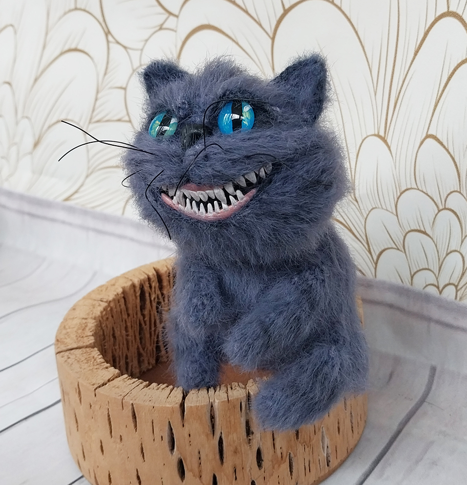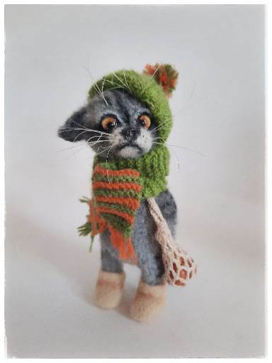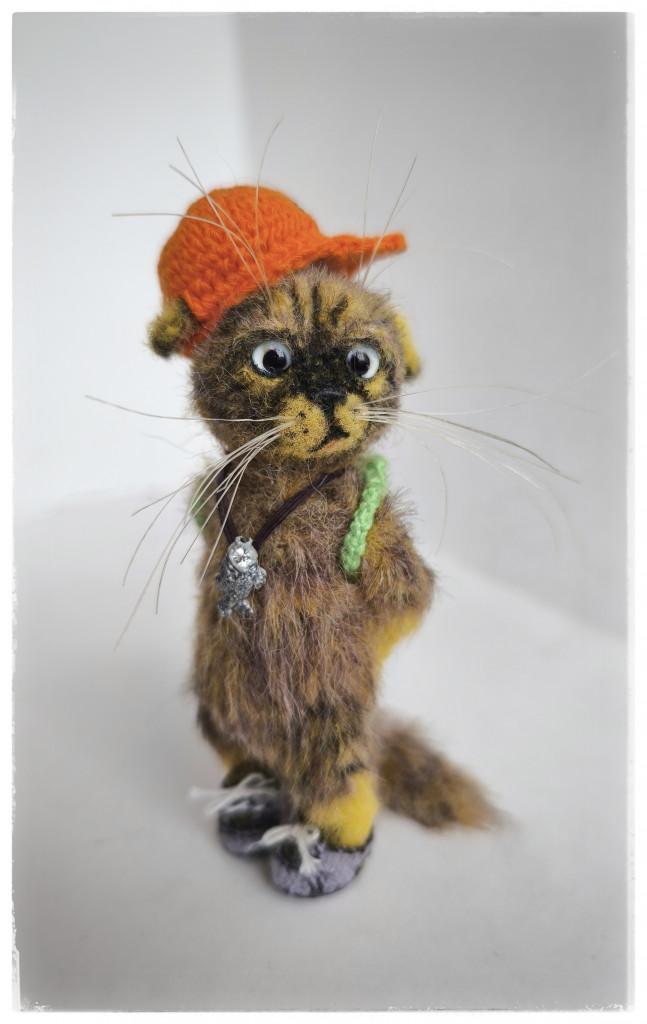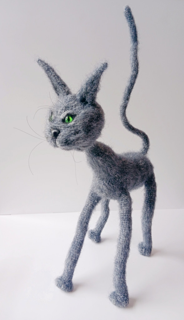 Кошка ростом 17 см, голова на шплинте, в лапках и хвосте меднопроволочный каркас. Каждый пальчик тоже гнётся, поэтому кошечка может держать предметы.