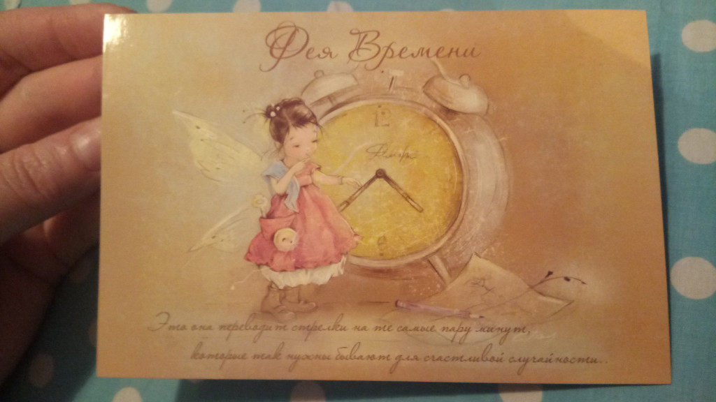 А от @Анюта8 прилетела феечка времени с хорошими пожеланиями. Очень, кстати, вовремя она, как раз бы переводить стрелки надо или час дополнительный ))) Фейка привезла с собой наклейки, сюрпризную открытку и закладку, весьма полезную! На ней еще и линейка, и таблица умножения, я как раз ее плохо знаю-математика не мой конек))))