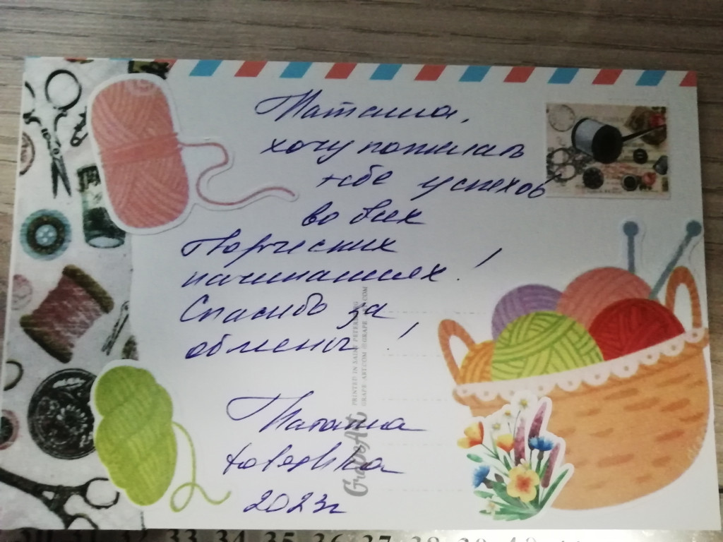 В посылочку кроме основного объекта обмена можно положить моточек ниточек, сладости, какую-нибудь атрибутику рукоделия. Получатель будет очень рад, такому дополнительному сюрпризу.