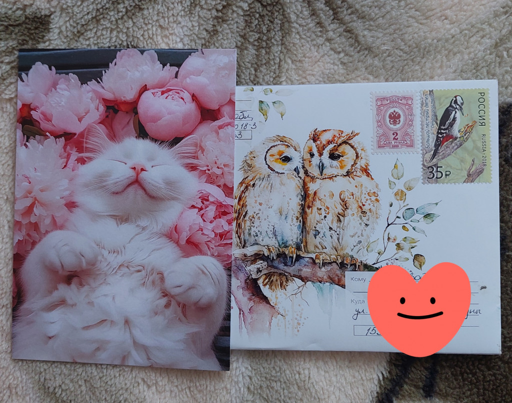 Там красавенный котик с поздравлением. А на конверте мои совушки любимые.