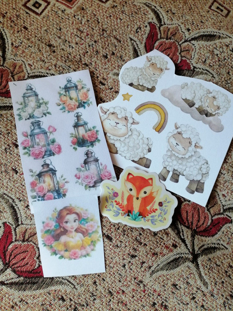 Конечно подарочки: открыточки, среди них ещё милый котик в коллекцию. :kat: Очень много красивых наклечеек.