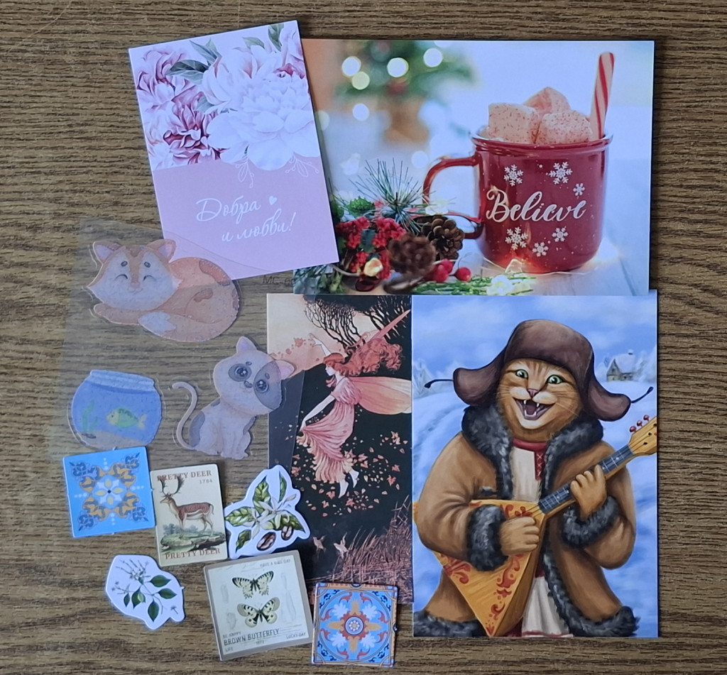 От @Madlena котик с балалайкой, я уж думала летняя потеряшка так долго гуляла (ведь в розыгрыши я такого выиграла, но не получила), а нет, это, думаю, Наташенька мне повторно выслала и новогодне подписала + еще новогодние открыточки, закладочка, наклеечки.