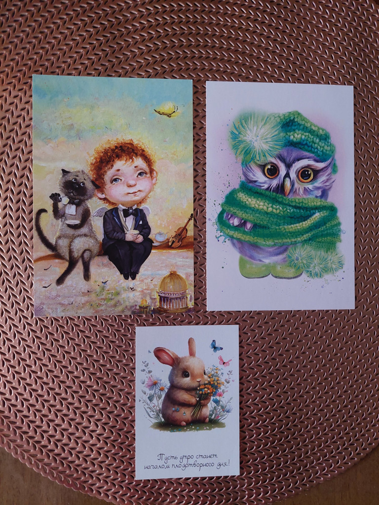 котик, милая совушка и мини-открытка с зайчиком. Всё в мою коллекцию.