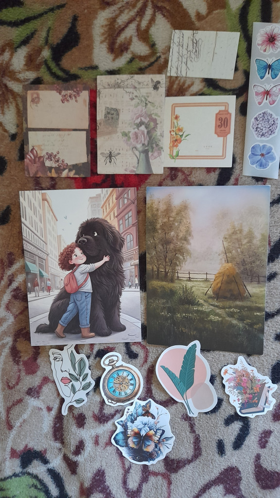 Я получила конверт(ище) от Жанны @nisana ))) Там, ожидаемо, была гора сокровищ-распечатки с крутыми гномами и фруктодомами, наклейки, цветочные листики, целая гора открыток чистых (такие все славные зверики, а пейзажная еще и с рельефом, как картина!)и, конечно же, подписаные и оформленные с оборота. По светлому обмену целых три, мишка со светлячками, фонарь и девушкс на крыше-красота.