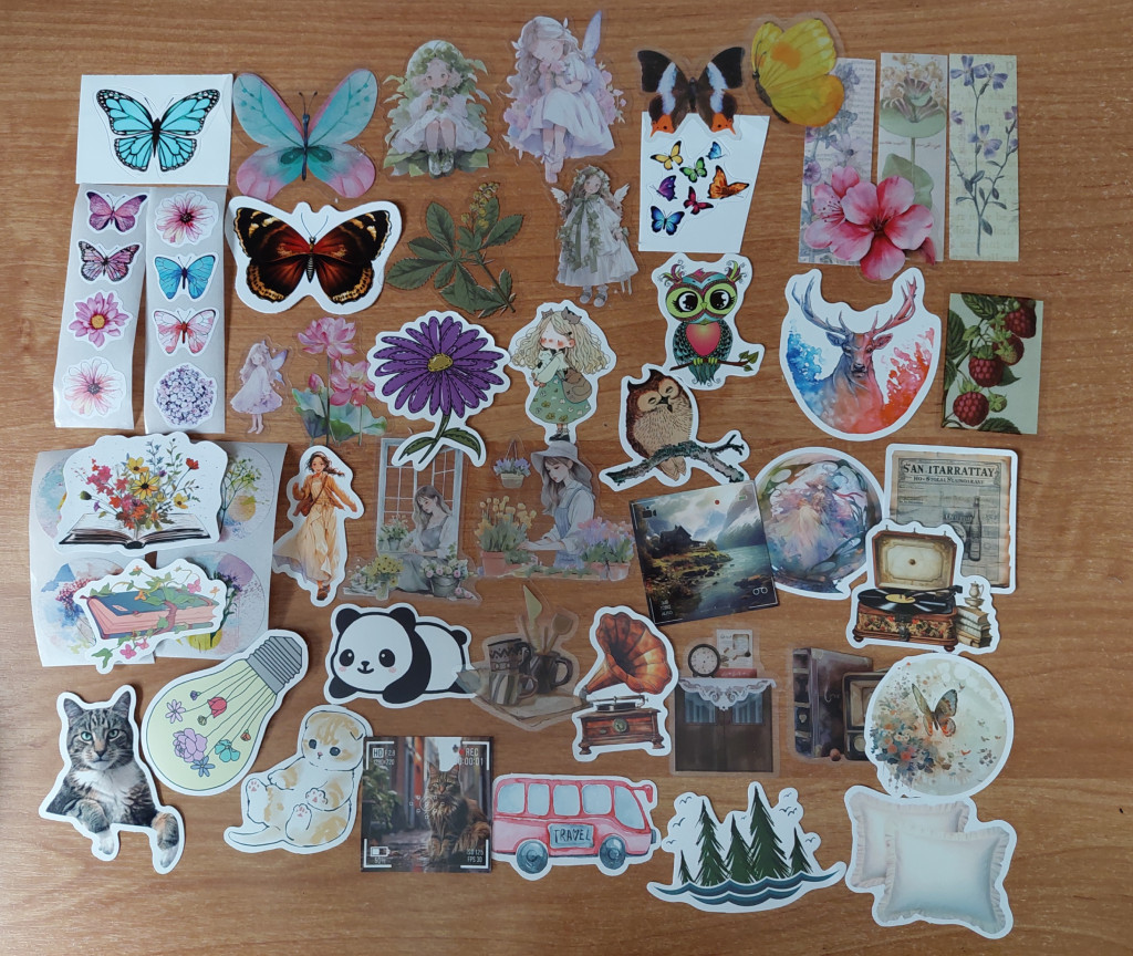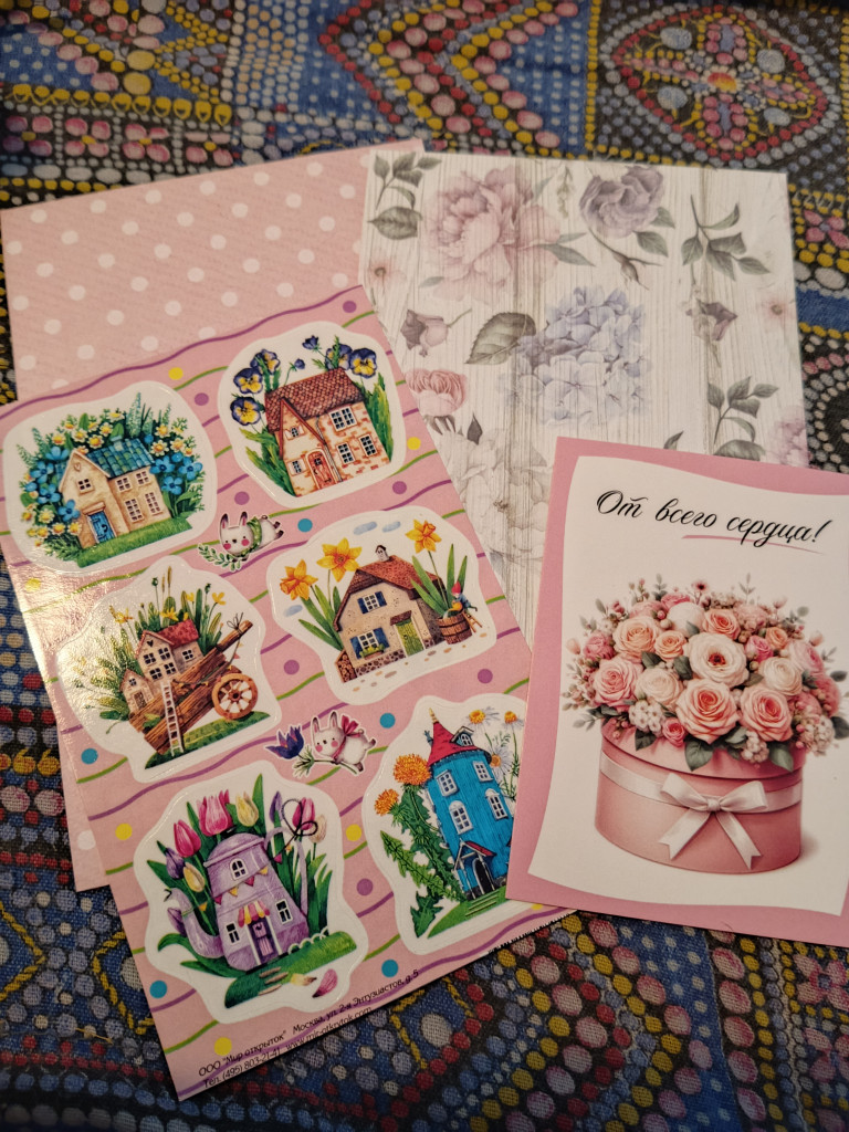 В конверте красивая открытка с поздравлением и очень добрыми пожеланиями. Внутри поздравления было много маленьких открыток в коллекцию и конвертик, в котором "спрятались" замечательные марки. А ещё в конверте были сюрпризные открытки, разные бумажности и пакетик с "морем" наклеек. Вот, столько красоты!