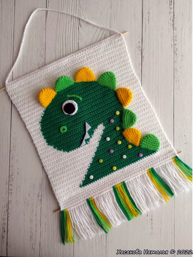 Панно Динозавр. Автор МК Татьяна Поддубская. Размер вязанной части 20*21 см
