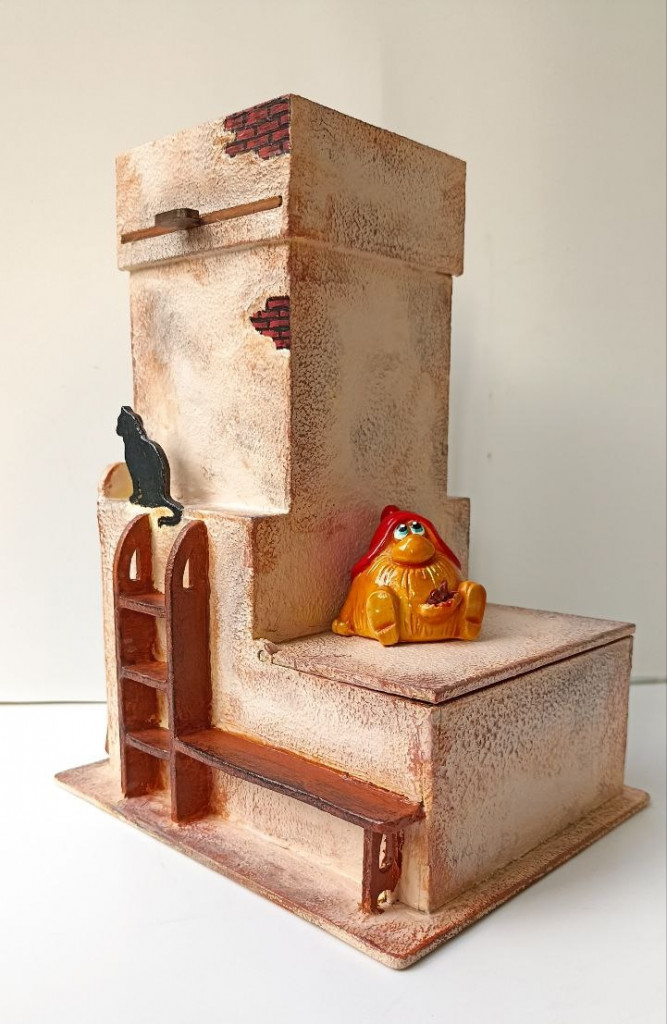 Очень удобная заготовка: можно использовать по назначению, а можно как вполне самостоятельную русскую печь для наших кукол и животинок. Хотела сначала декора для неё понаделать: кувшины, сковородки, поленницу... а потом решила, что возможно и не нужно, так что пока у меня просто печка, хранительница чайных пакетиков. Отштукатуренная, тонированная акридом и покрытая на несколько слоёв лаком.