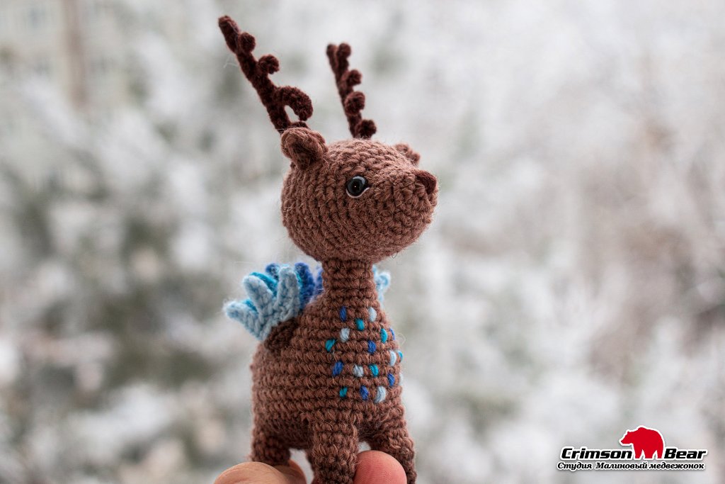 Мифический крылатый олень, родом из Атлантиды. Связан из шерстяной пряжи, наполнен холлофайбером. Размер до макушки 10 см, до кончиков рогов 14 см. Глазки пластиковые на безопасном креплении.