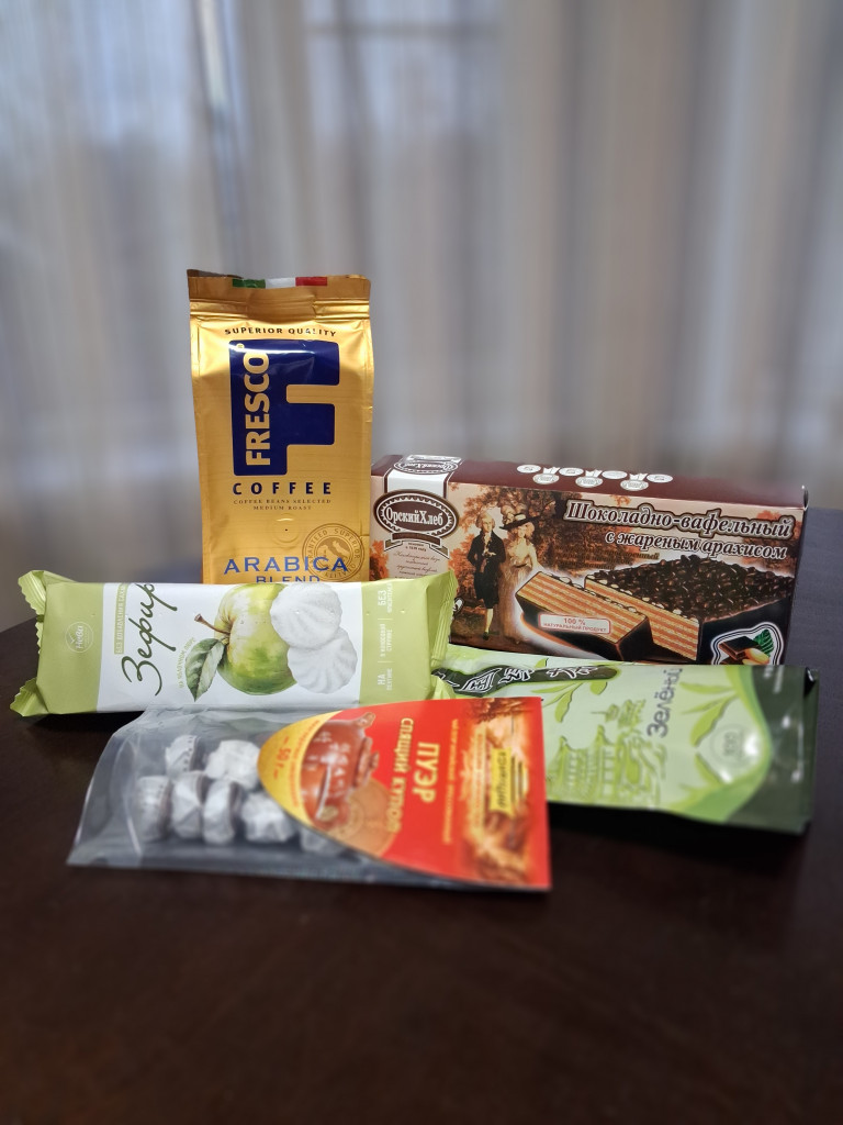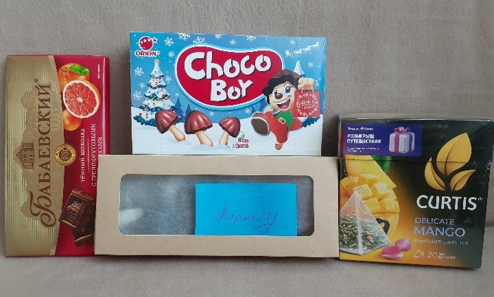 Приехала ко мне посылочка, открываю я,значит, коробочку, а там ещё коробочка, красиваяяя А внутри она, главная героиня следующего года И сама красавица, и с подарками приехала, пряжа очень нужная А чай с вкусняшками выше всяких похвал, тут и фирменный Орский вафельный тортик ( успеть бы попробовать) , и зефирки,и кофе (!!!), и чай китайский (мечтала о нем