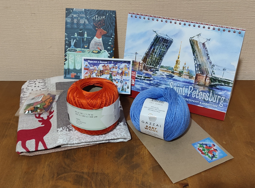 ), дак еще и Санкт-Петербург в акварелях, я такое люблю. Остальное тоже все прям в елочку и нитки , и полотенчики, и чудесная новогодняя открытка с поздравлениями, и сладенькое к чаёчку